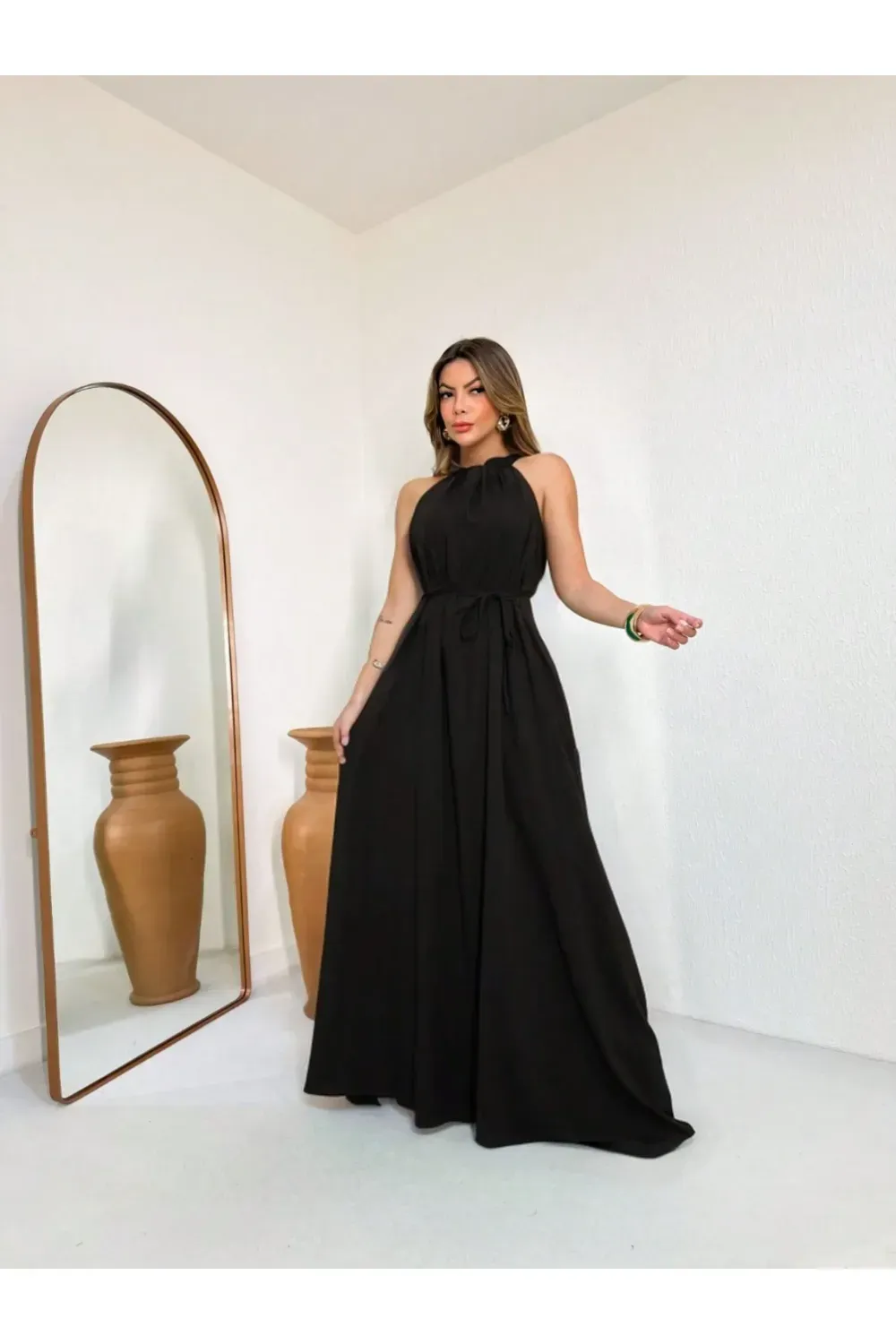 nome: vestido longo gola alta liso com cinto.