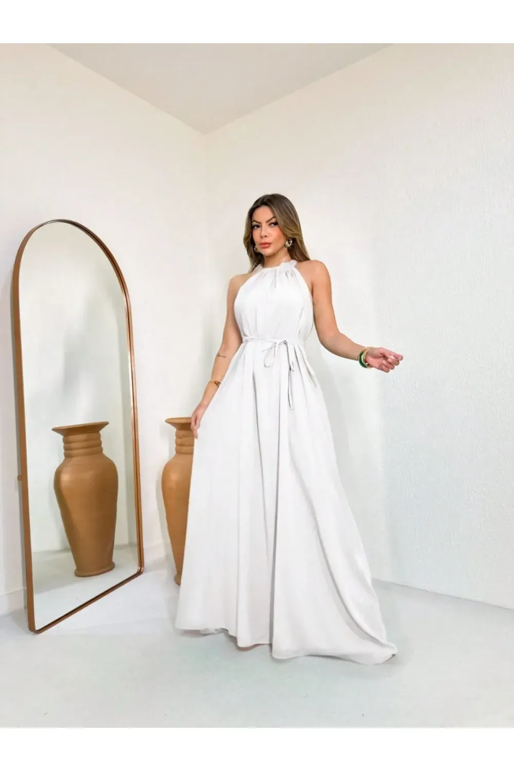 nome: vestido longo gola alta liso com cinto.