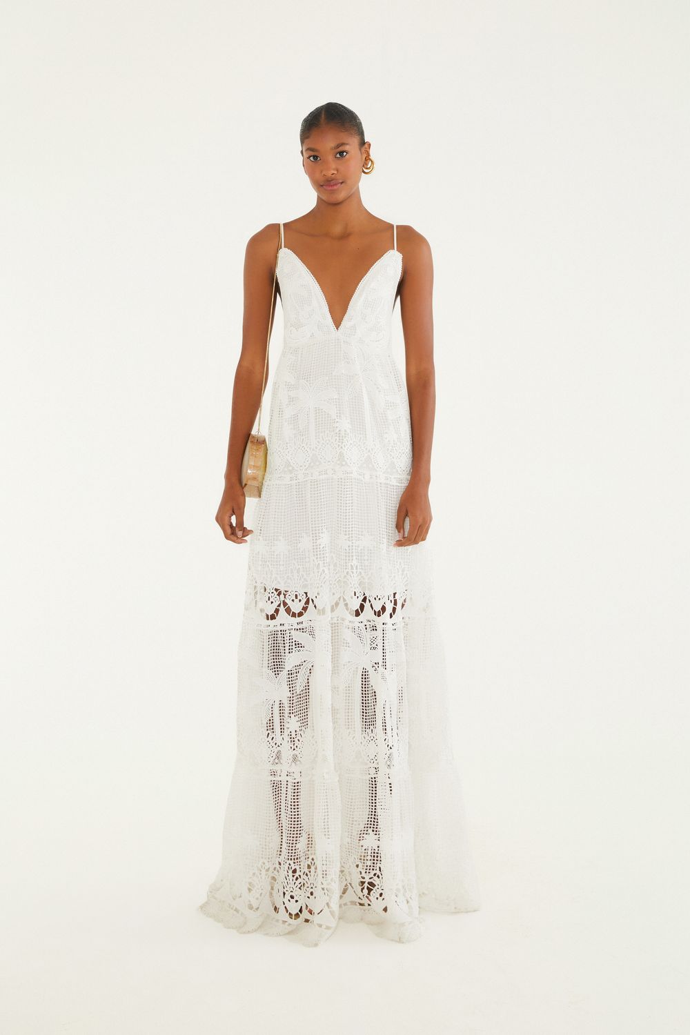 vestido longo guipure Odara. um verdadeiro charme com decote em coração que realça o colo e alças delicadas. sua renda guipure traz um toque de originalidade e leveza. a modelagem fluida e o caimento impecável fazem deste vestido uma escolha perfeita para eventos casuais e passeios diurnos. FARM RIO original - alto verão 26.-