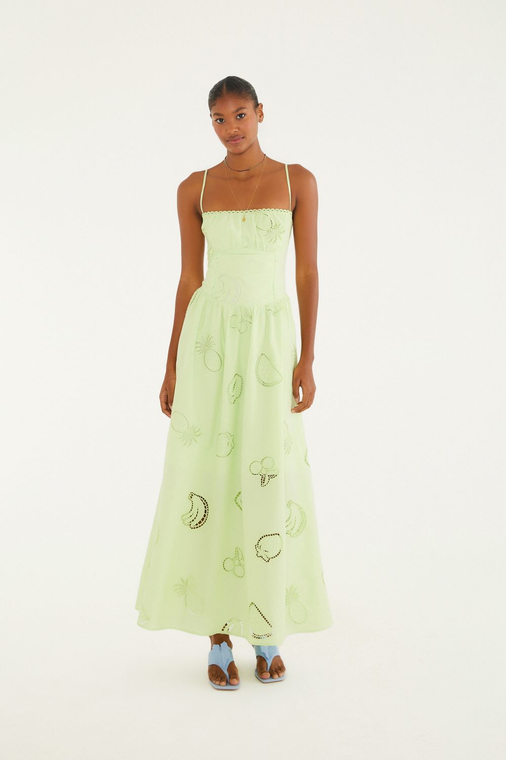 vestido longo laise buquê, com alças finas e decote quadrado, traz frescor e um toque de autenticidade. a modelagem esvoaçante casa bem em encontros casuais ou momentos especiais. a textura delicada complementa o estilo, sendo a escolha ideal para quem busca leveza. FARM RIO original - alto verão 26.-