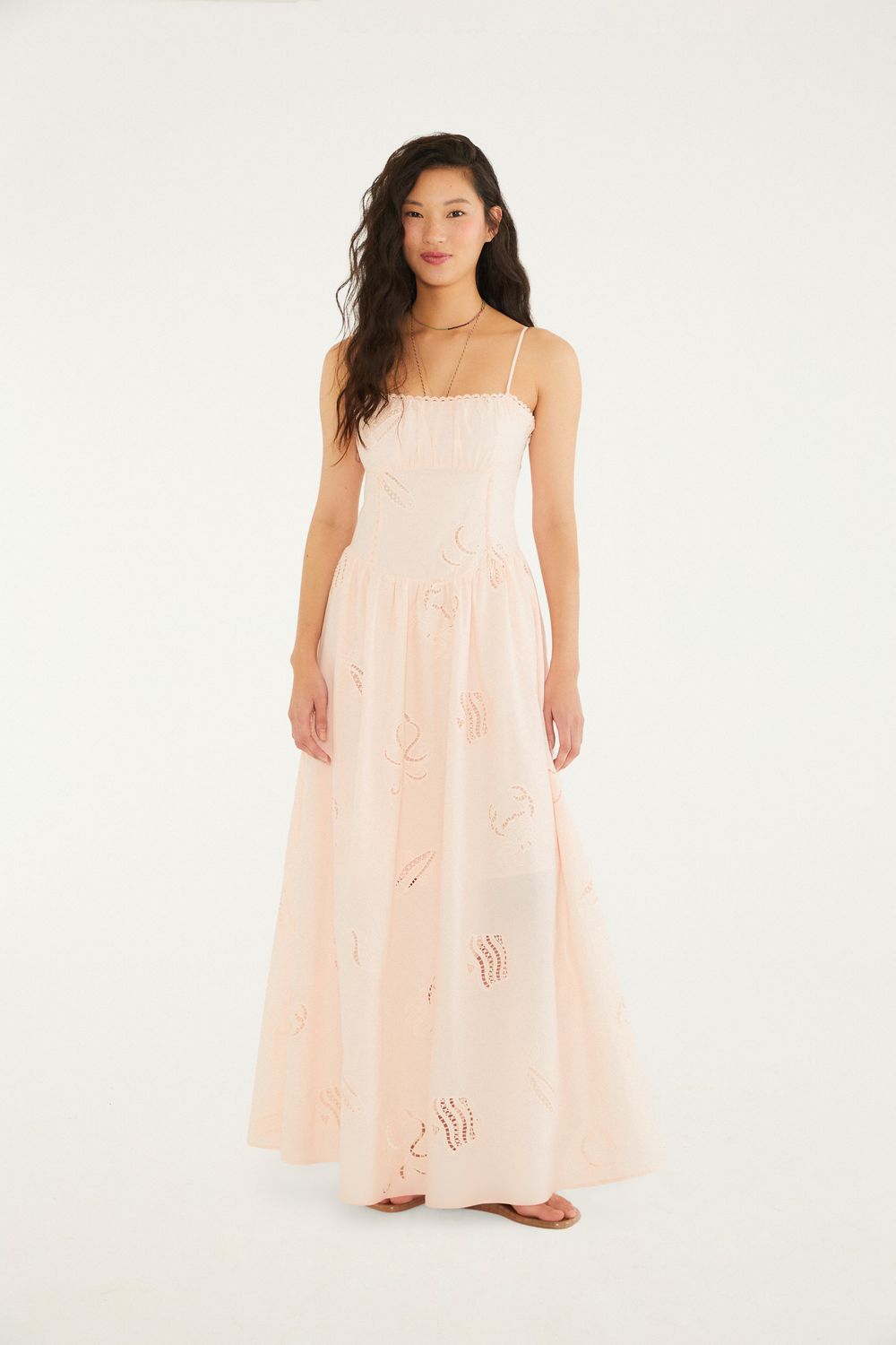 vestido longo laise fundo do mar. apresenta decote reto e alças finas ajustáveis, proporcionando um charme delicado. a modelagem fluida é complementada por babados discretos na saia, que conferem movimento. ideal para um passeio à beira-mar ou um evento casual especial. FARM RIO original - alto verão 26.-