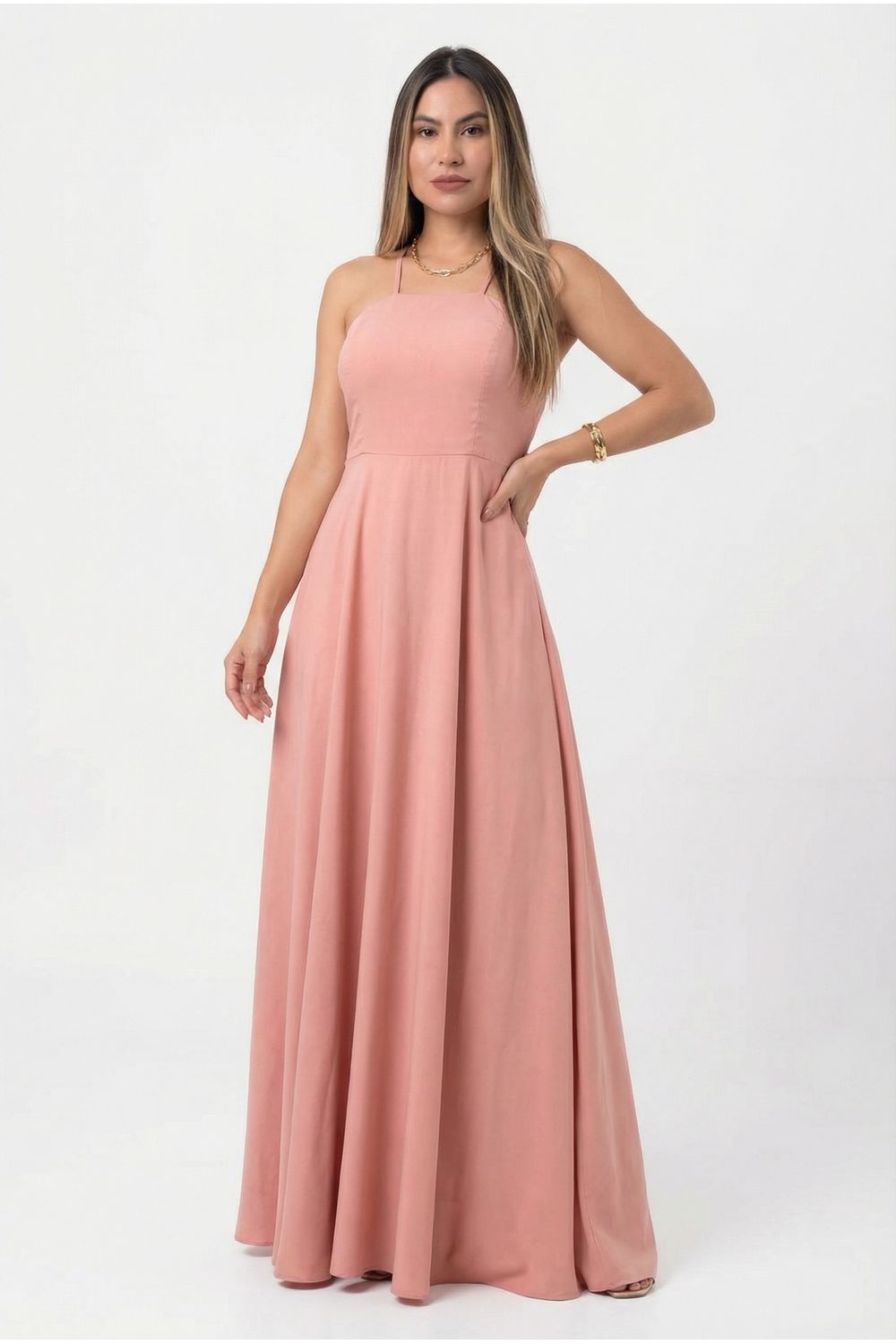 nome: vestido longo liso frente única com fenda.
