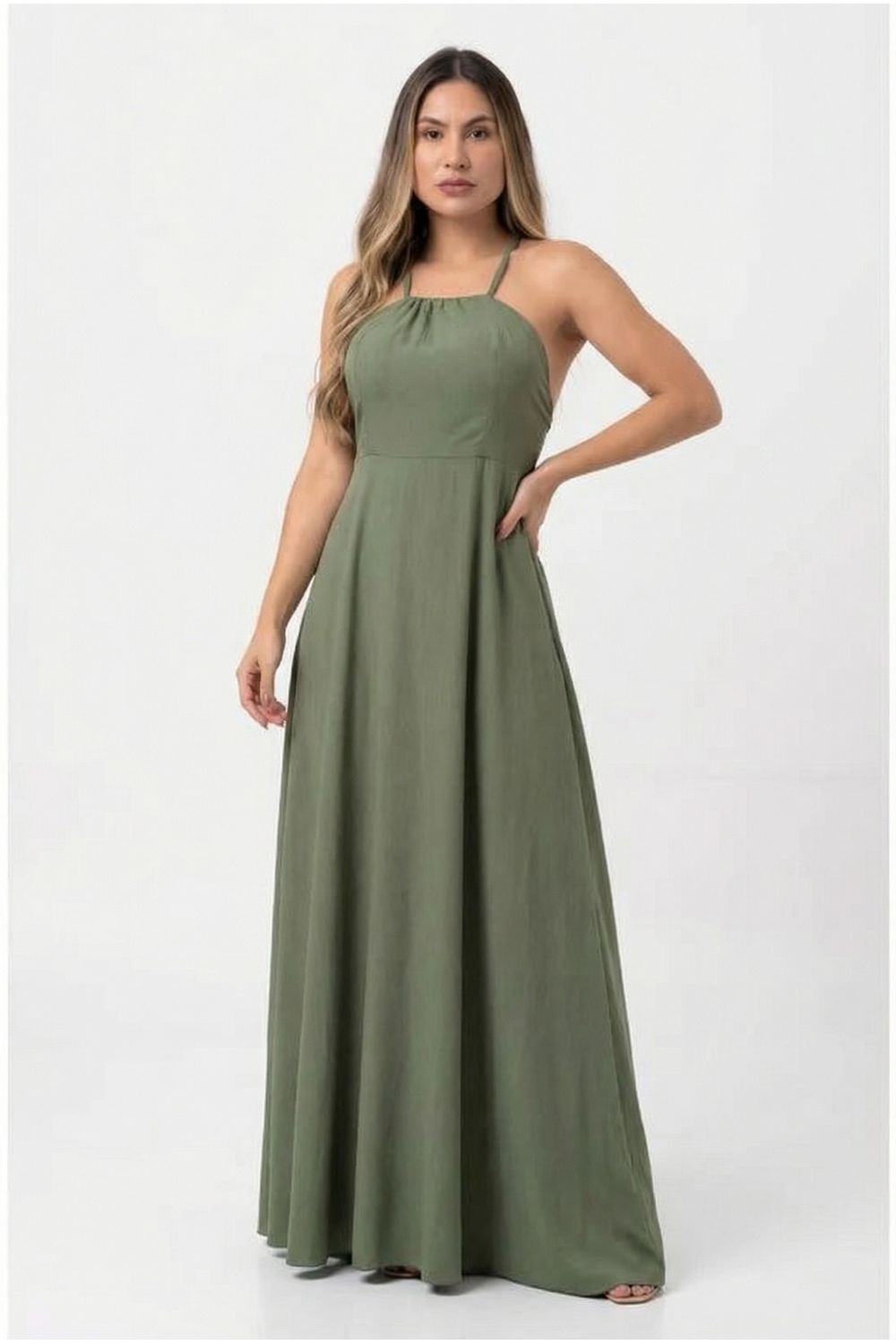 nome: vestido longo liso frente única com fenda.