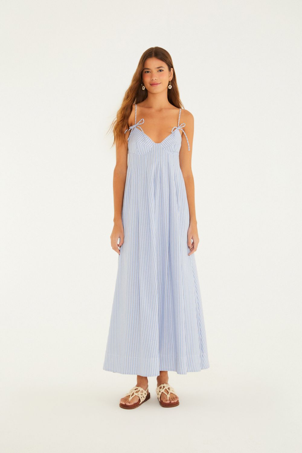 vestido longo listra azul traz a leveza com suas alças finas ajustáveis e decote em v, perfeito para dias de calor. seu tecido fluido e o corte solto proporcionam um caimento confortável, ideal para um passeio casual ou um encontro especial. peça cheia de originalidade, que se adapta a diversas ocasiões. FARM Rio, coleção Carioca - inverno 26.-