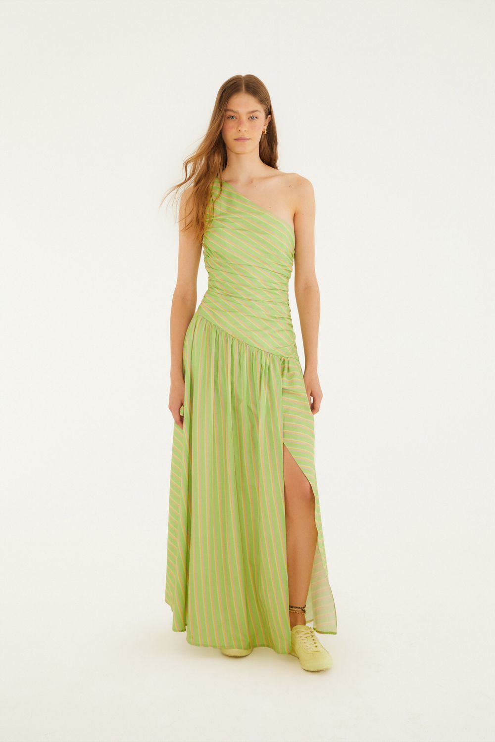 vestido longo listra pina verde. confeccionado em material leve, traz um design moderno de um ombro só e fenda lateral que proporciona movimento único. a modelagem fluida permite um toque especial para ocasiões casuais ou eventos mais sofisticados. FARM RIO original - alto verão 26.-