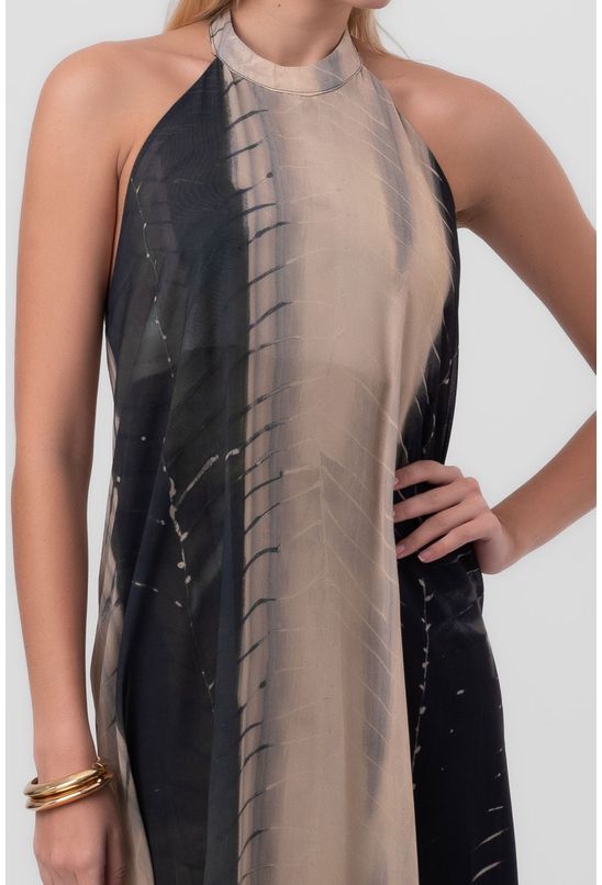 Este deslumbrante vestido longo combina elegância e estilo de forma extraordinária. Com um modelo frente única, destaca-se pela modelagem ampla que proporciona movimento gracioso. O tecido leve e fluido nas sofisticadas cores preto e dourado adiciona um toque de glamour à peça, tornando-a ideal para ocasiões especiais. Este vestido é a escolha perfeita para quem busca uma combinação de sofisticação e leveza em um design deslumbrante