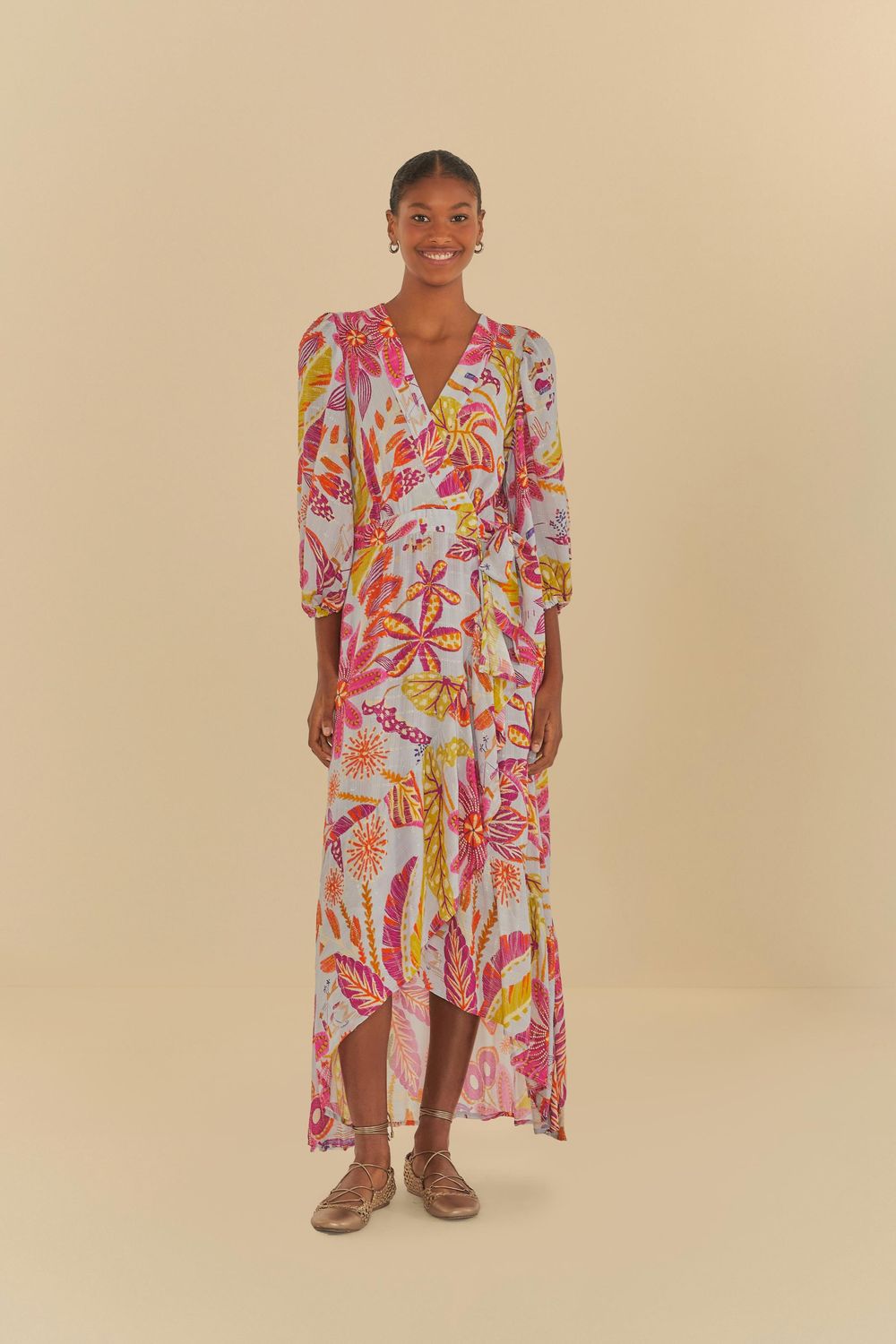 vestido longo manga estampado floresta de sonho. possui decote v com transpasse, mangas longas bufantes com punhos ajustados e detalhe de cordinha para amarração. a modelagem fluida traz movimento leve e encantador à peça. perfeito para ocasiões diurnas e noturnas, garantindo sempre um toque especial. FARM RIO original - inverno 25.-