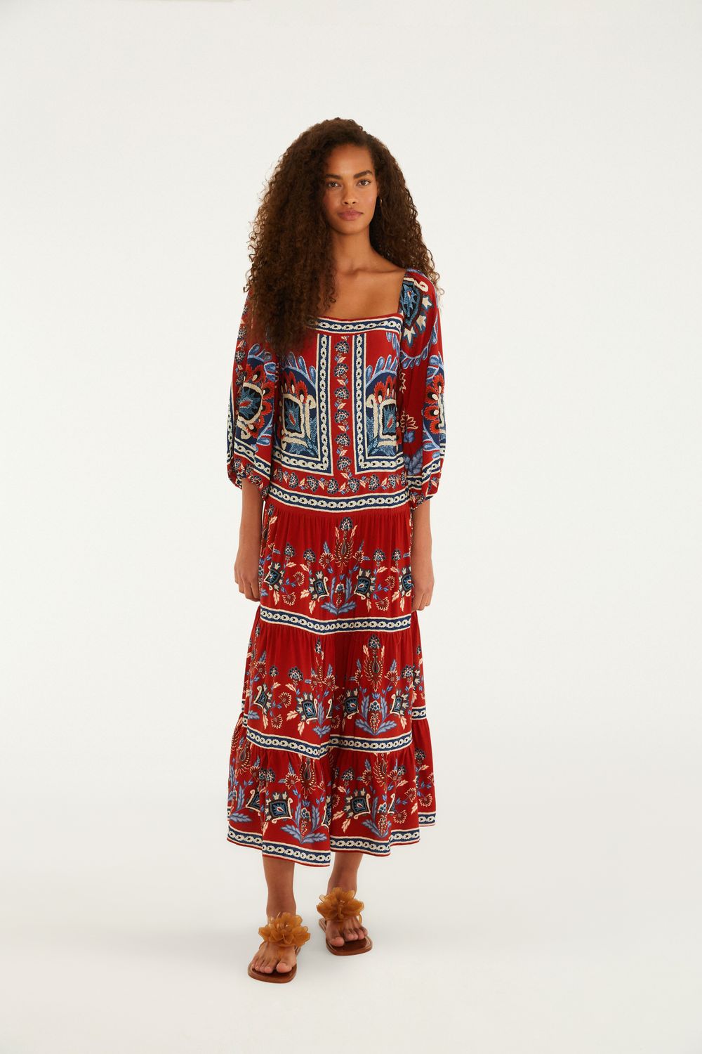 vestido longo manga estampado lenço náutico. com decote quadrado e mangas bufantes, é ideal para aquele passeio casual à beira-mar ou um jantar ao ar livre. a modelagem solta proporciona conforto, enquanto os detalhes em camadas trazem um charme único. perfeito para quem busca personalidade em cada detalhe. FARM RIO original - verão 26.-