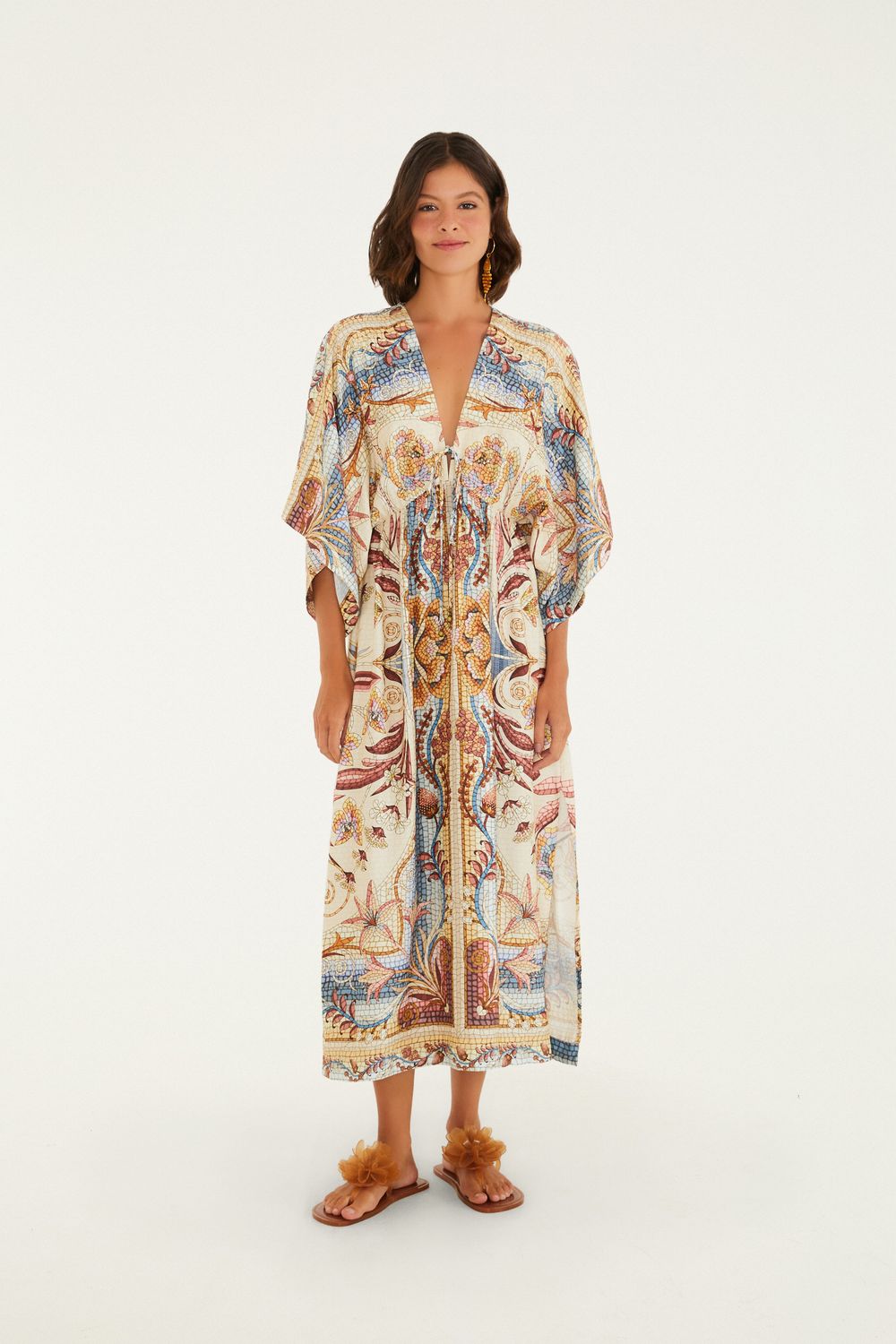 vestido longo manga estampado vitral do mar. com decote em v, cordinha ajustável e ponteiras de tassel, este vestido é uma obra de arte em movimento. as mangas amplas garantem fluidez, enquanto o tecido leve traz conforto. perfeito para um dia casual ou uma noite especial. FARM RIO original - verão 26.-