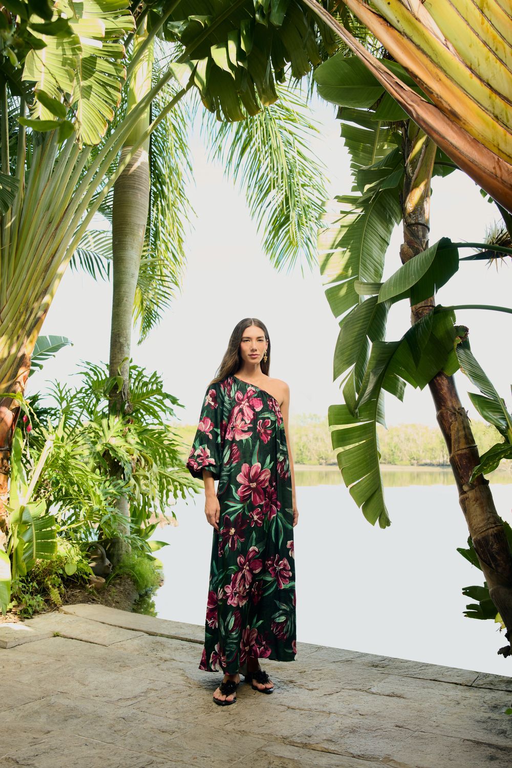 vestido longo ombro só estampado lineia. destaca-se pelo design assimétrico com um ombro à mostra, trazendo um toque único. as mangas amplas e o caimento fluido proporcionam conforto e leveza. perfeito para ocasiões casuais ou eventos ao ar livre, este vestido eleva qualquer produção. FARM RIO original - verão 26.-