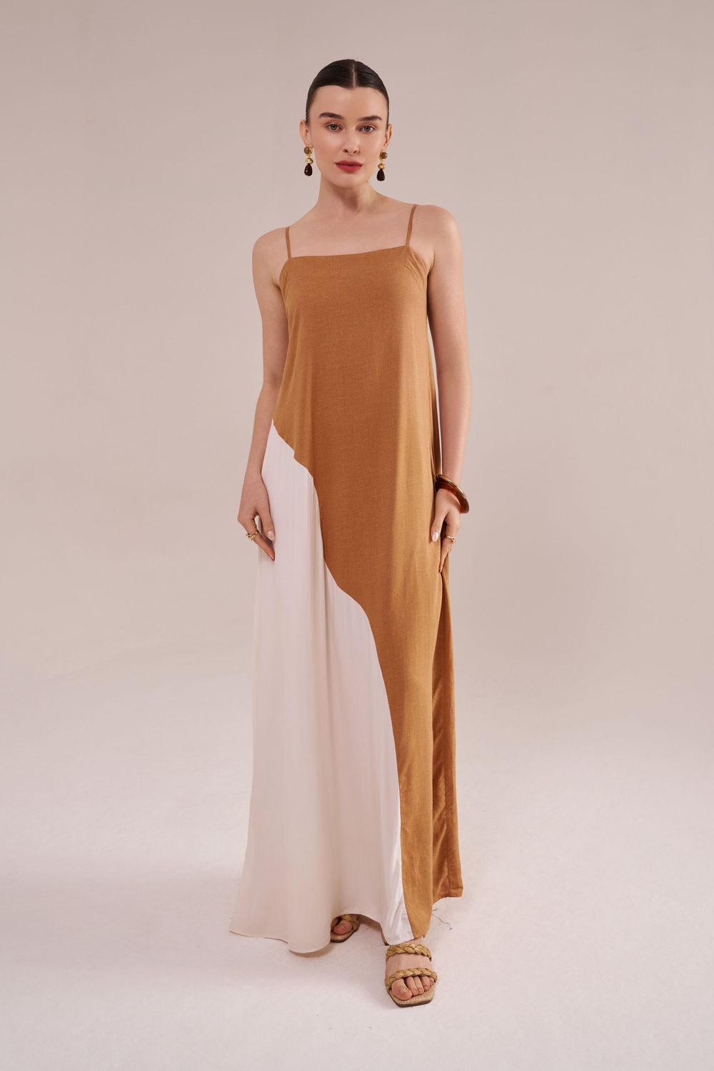 vestido com decote reto, modelagem super ampla, alças finas paralelas e ajustáveis, possui elástico nas costas para melhor caimento. confeccionado em linho e viscose em dois tons diferentes: palha e off white , unidos por costura, formando um belo desenho orgânico de ondas verticais. perfeito!-