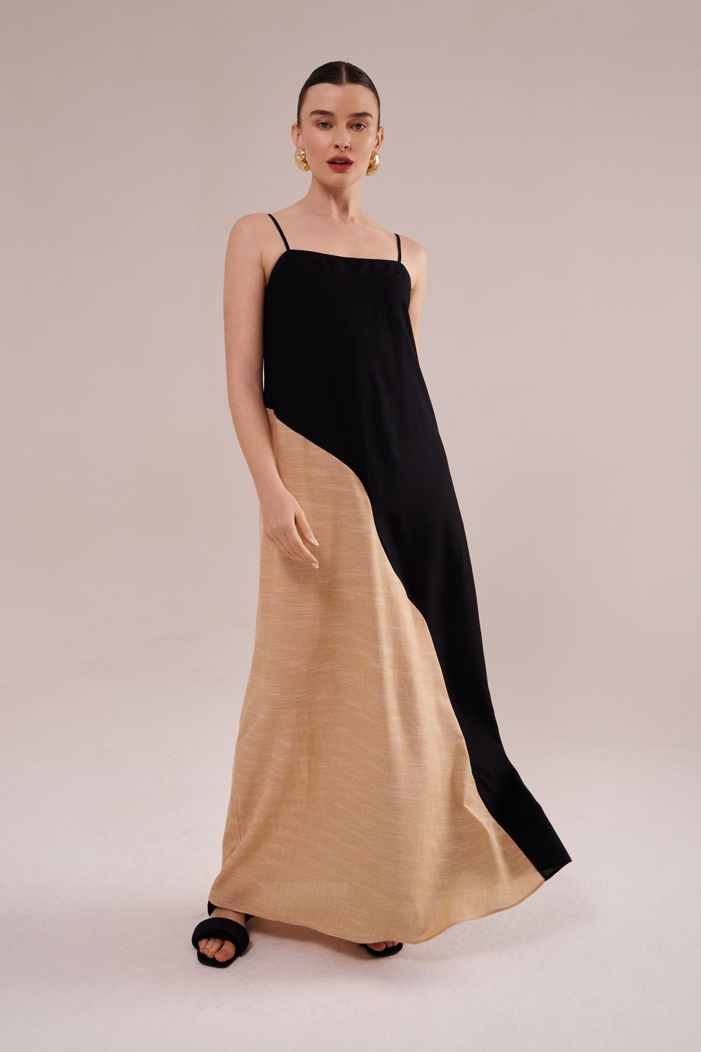 vestido com decote reto, modelagem super ampla, alças finas paralelas e ajustáveis, possui elástico nas costas para melhor caimento. confeccionado em linho e viscose em dois tons diferentes: preto e caramelo , unidos por costura, formando um belo desenho orgânico de ondas verticais. perfeito!-
