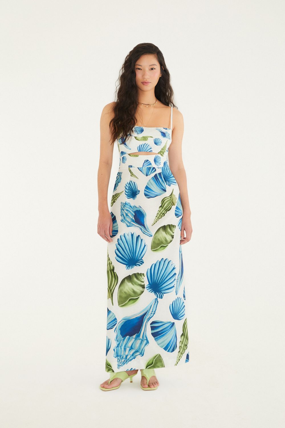 vestido longo reto estampado concha litoral. com alças finas e decote quadrado, traz um ar casual e leve. o corte reto e tecido fluido garantem movimento e conforto. perfeito para um passeio à beira-mar ou um almoço descontraído ao ar livre. FARM RIO original - alto verão 26.-