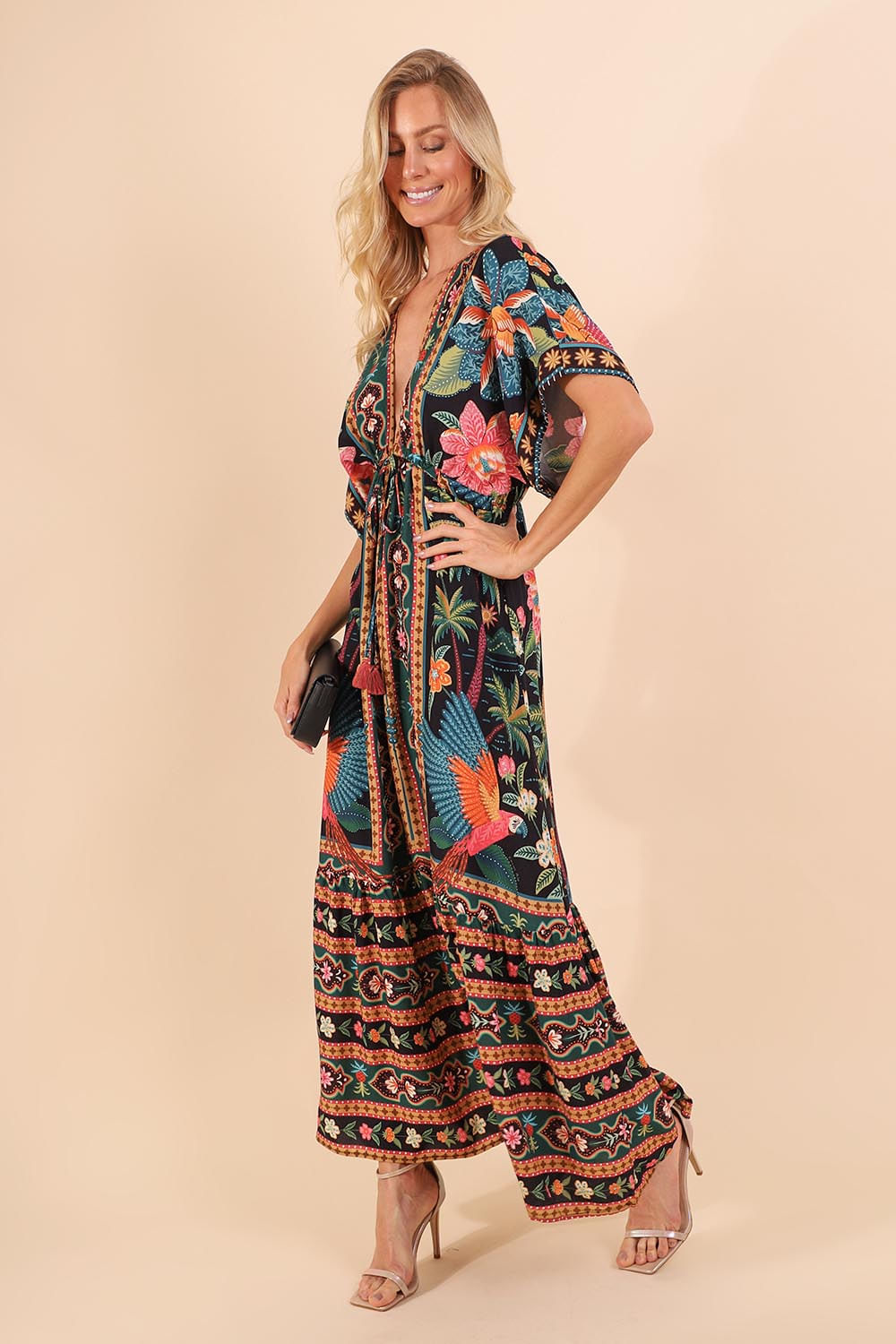 vestido longo estampado samba das araras. possui decote em v com cordinha embutida no tecido bem baixo do busto, para ajuste e amarração, finalizada com ponteiras de tassel de linha. mangas curta e quadrada. o modelo é soltinho de viscose e possui babado largo finalizando o barrado
