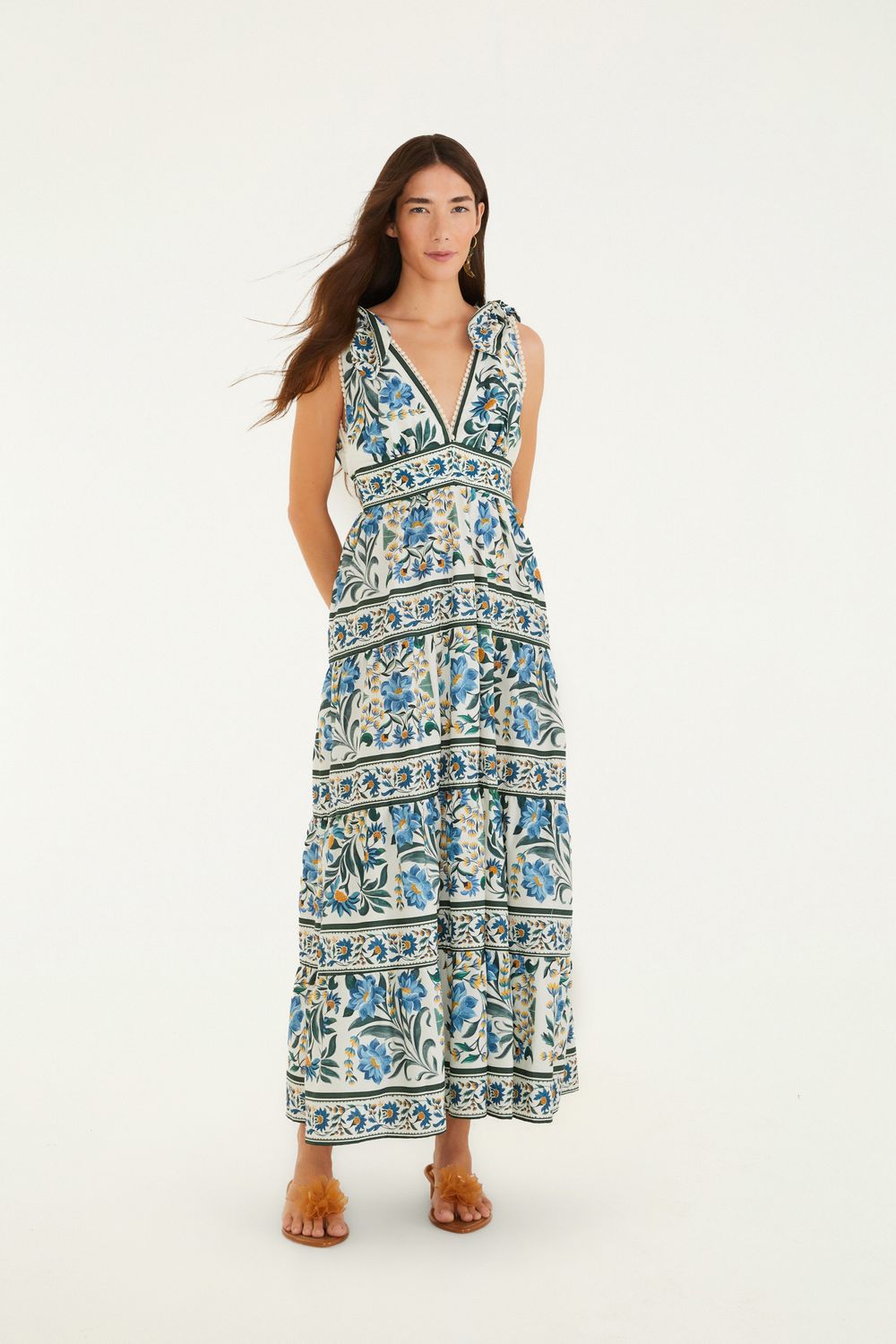 vestido marias estampado manoela. possui decote em v profundo que se destaca e alças largas que conferem conforto. a peça traz um corte fluido e leve, ideal para um look casual em dias ensolarados. o caimento destaca o estilo descontraído, perfeito para passeios ao ar livre ou encontros. FARM RIO original - verão 26.-