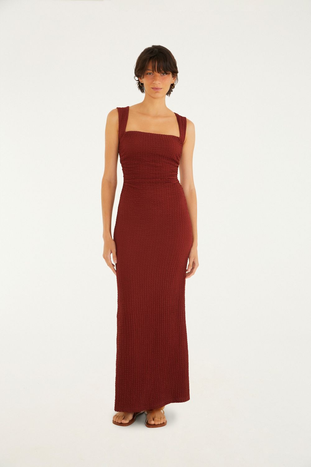 vestido midi alça torcida textura: um toque de originalidade que transforma o casual em exclusivo. o decote quadrado harmoniza com alças torcidas, trazendo um detalhe único. a modelagem fluida garante leveza e conforto, ideal para encontros e passeios. sinta a autenticidade em cada detalhe. FARM RIO original - verão 26.-