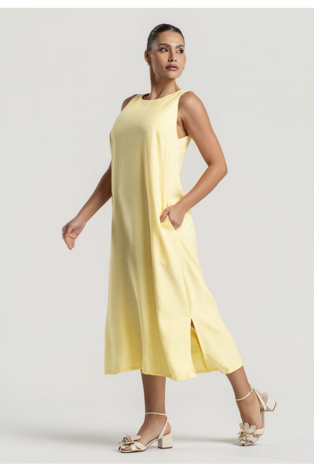 Refresque seus dias com o charme descontraído do vestido midi regata com fendas laterais e bolsos.