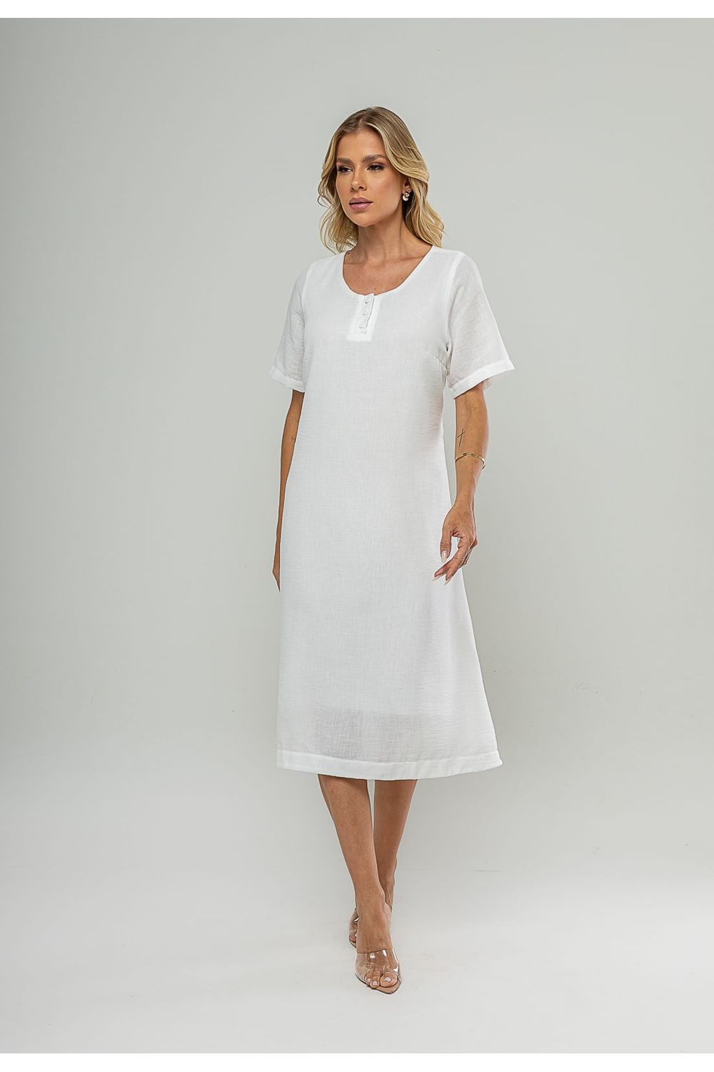 Com proposta clean e elegante, este vestido midi feminino é ideal para quem valoriza praticidade sem abrir mão de um visual bem-acabado.