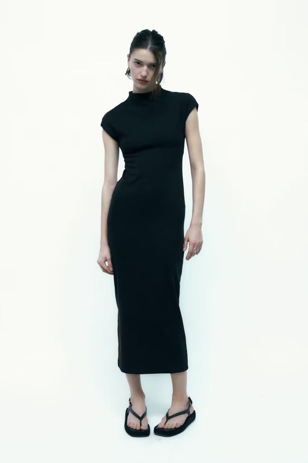 Vestido midi canelado, manga curta, gola alta preto