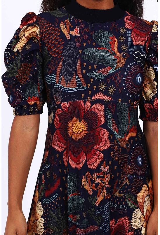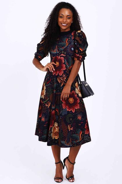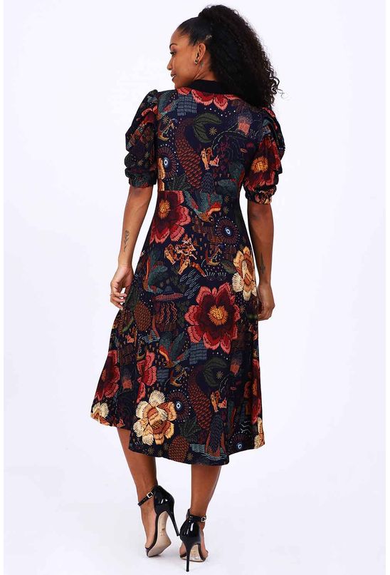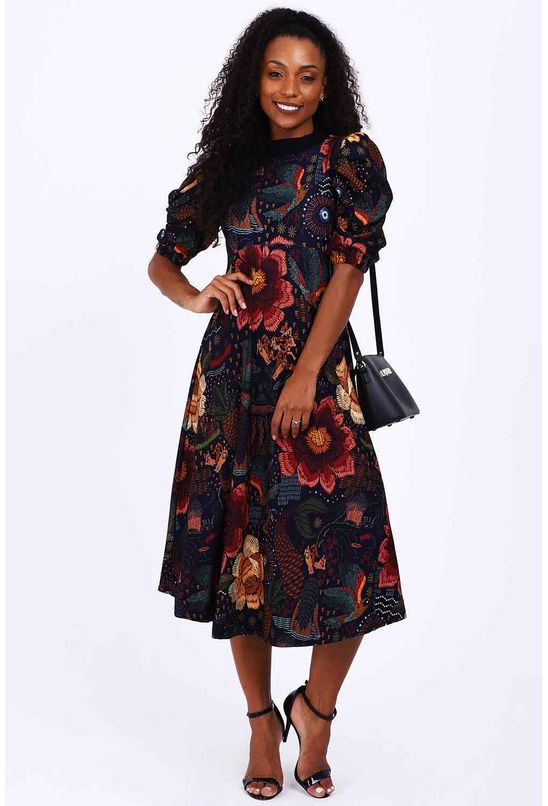 Vestido farm midi, decote careca, estampado , cor azul, manga bufante, manga curta, tecido elastano e viscose. *as peças podem variar de estampa e tonalidade.