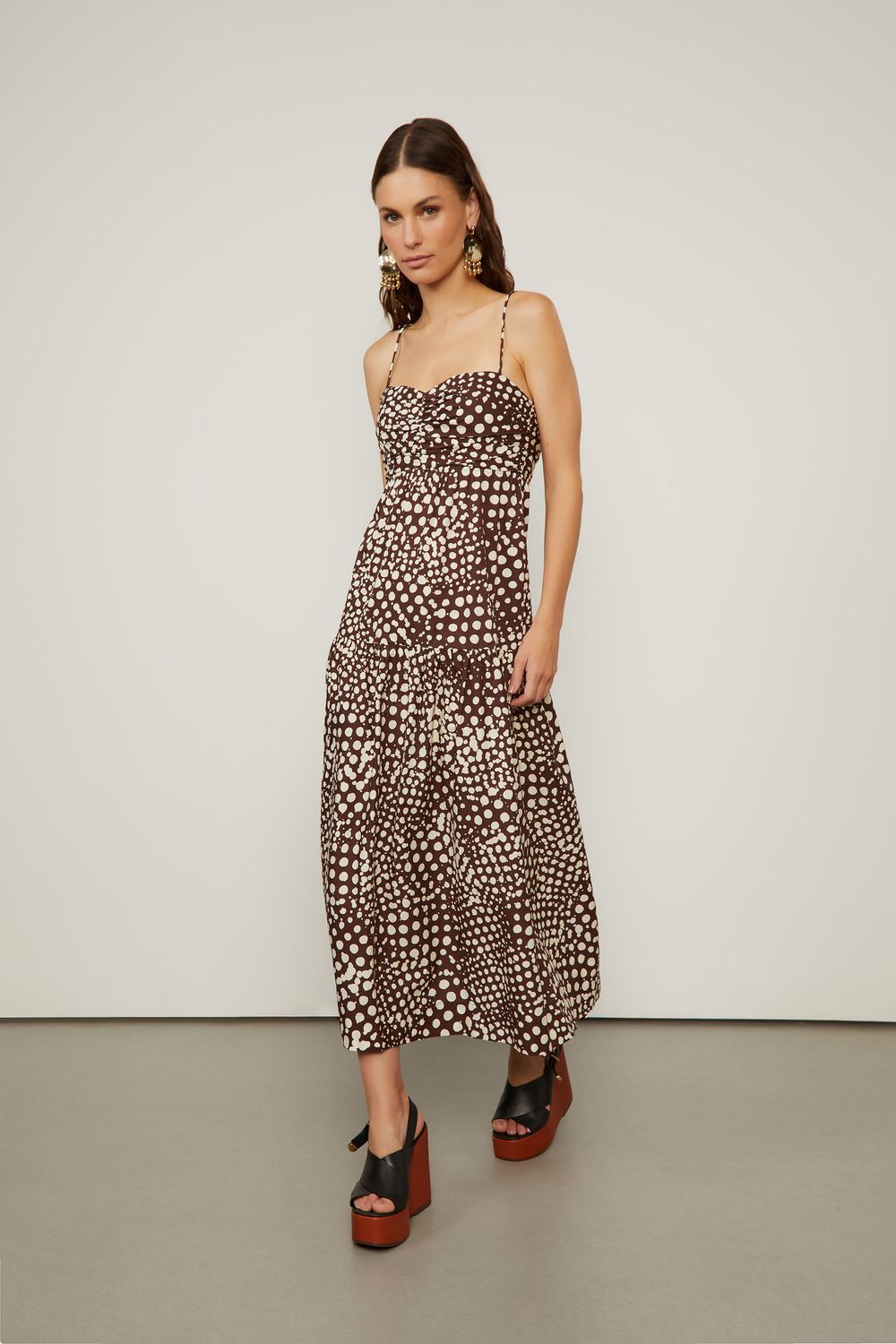 O Vestido Midi de Algodão Estampado possui alças, busto franzido, fechamento por zíper nas costas e barra rodada. Uma proposta easy chic para o dia a dia.