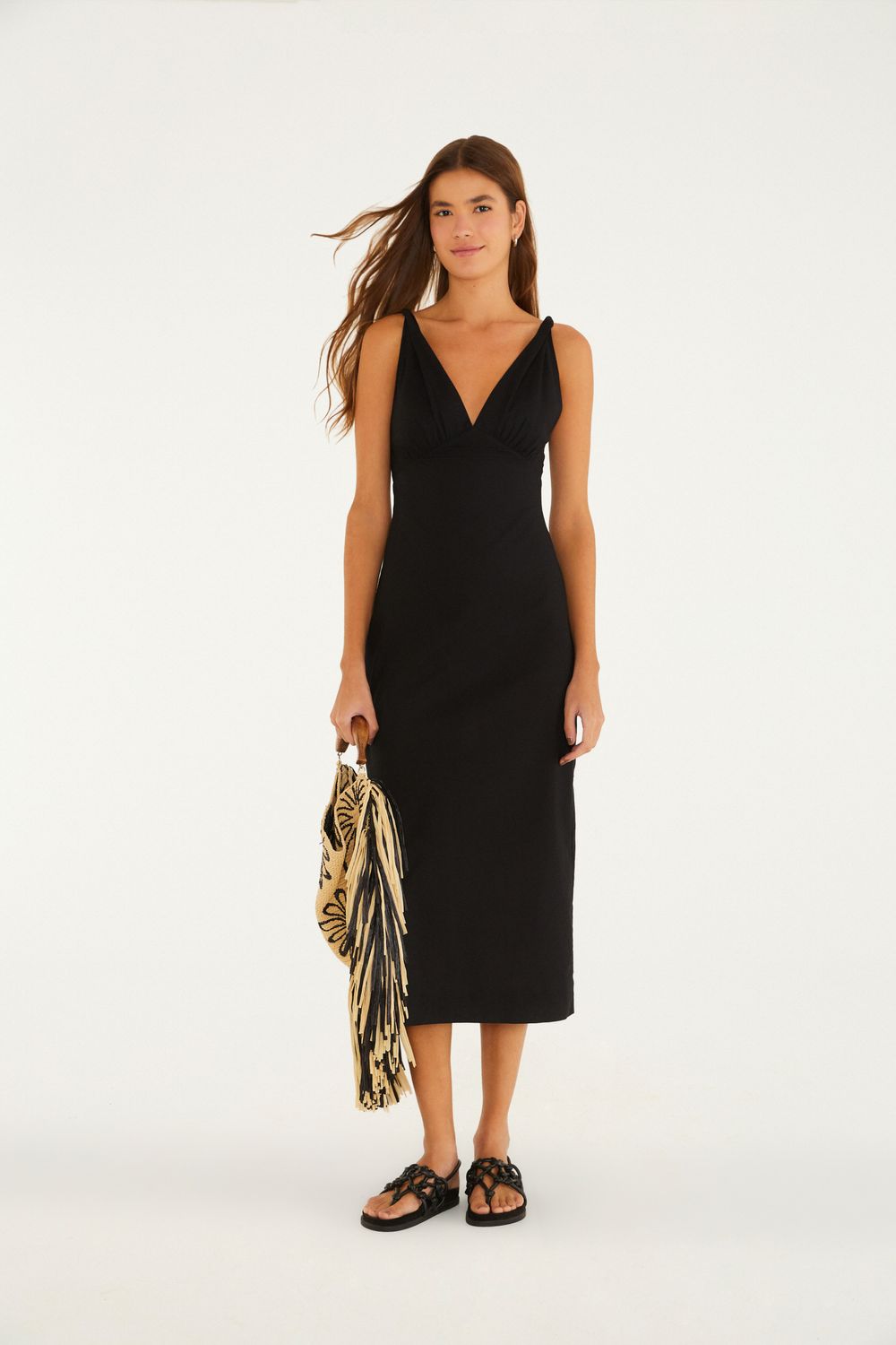 vestido midi decote v. com alças finas, destaca-se pelo decote suavemente profundo, que adiciona um toque especial à produção. corte midi e modelagem minimalista garantem versatilidade, ideal tanto para encontros casuais quanto para eventos mais formais. uma peça que vai do dia à noite com a mesma leveza. FARM Rio, coleção Carioca - inverno 26.-