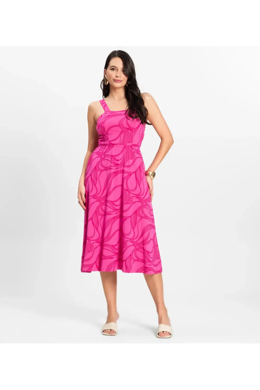 Vestido midi confeccionado em Viscotorcion, com alças em friso, frente dupla que garante melhor acabamento e sustentação, recortes estratégicos que valorizam a silhueta e elástico na cintura para ajuste confortável. Possui barra finalizada com bainha larga, ideal para compor looks elegantes e frescos em dias quentes.-
