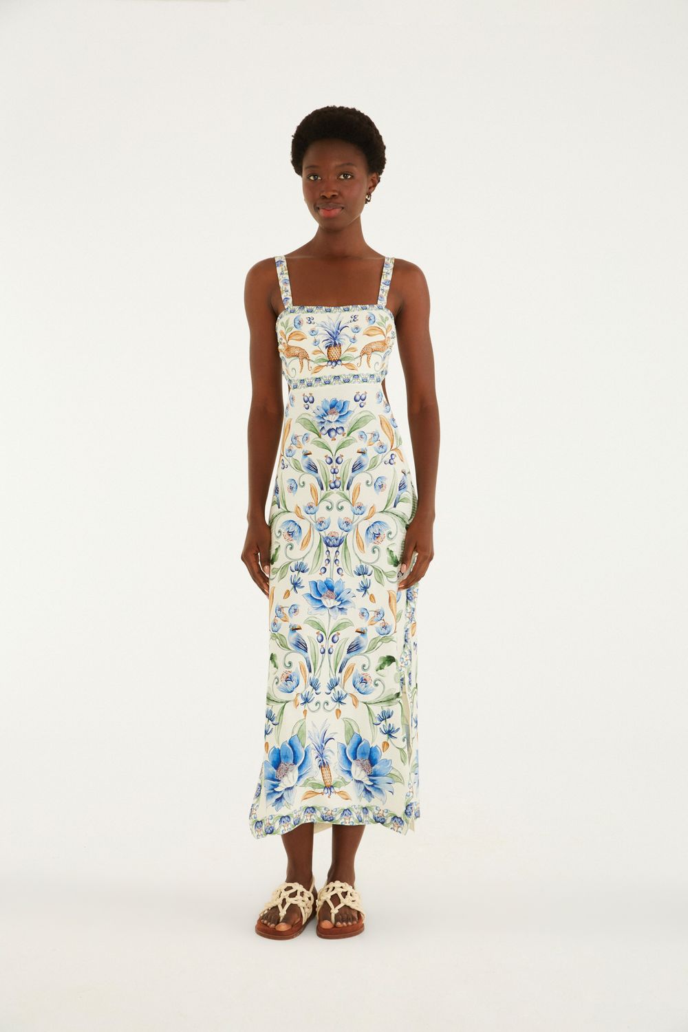 vestido midi elsa. alças ajustáveis e decote quadrado que se destaca. lateral com recorte sofisticado e amarração nas costas traz personalidade. leve e fluido, ideal para ocasiões de primavera à beira-mar ou passeios urbanos. tecido confortável e corte que garante liberdade nos movimentos. promete encantar em qualquer situação do dia a dia. FARM Rio, coleção Carioca - inverno 26.-