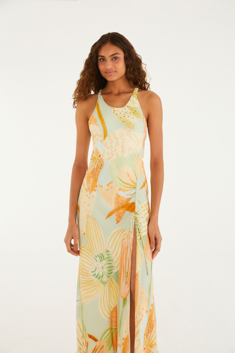 vestido midi florie é a escolha certeira para momentos especiais. com seu decote frente única e modelagem que preza pelo movimento, traz amarração estratégica lateral com leve franzido, conferindo originalidade. confeccionado em tecido confortável, ele transita facilmente entre ocasiões casuais e eventos descontraídos. FARM Rio, coleção Carioca - inverno 26.-