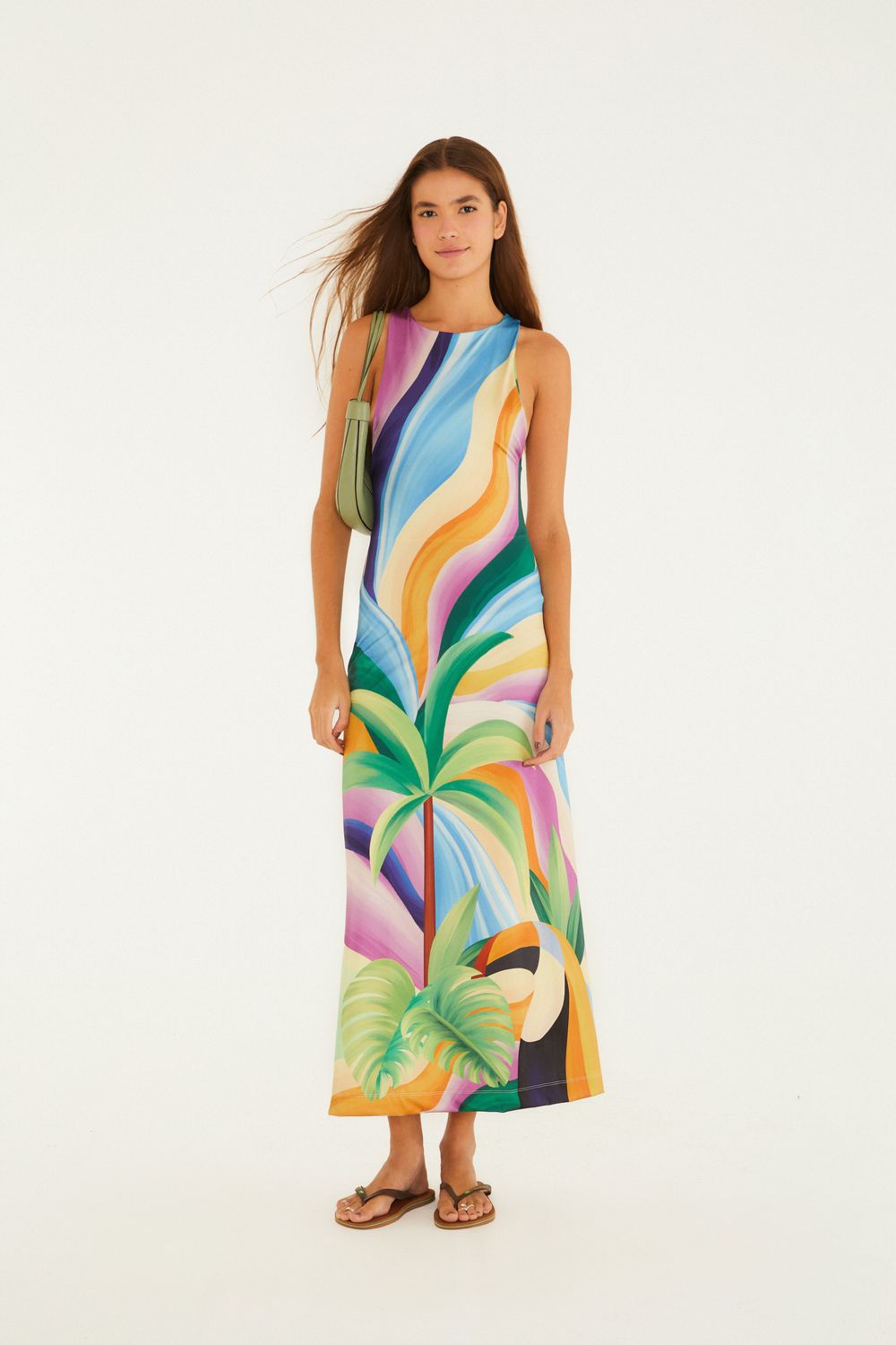 vestido midi montanha de tucano. com decote arredondado e alças largas, a peça possui uma modelagem reta que proporciona conforto e leveza. esta peça é perfeita para eventos casuais e almoços especiais. o design exclusivo e a estampa original garantem um look único. aproveite essa criação autêntica. FARM Rio, coleção Carioca - inverno 26.-