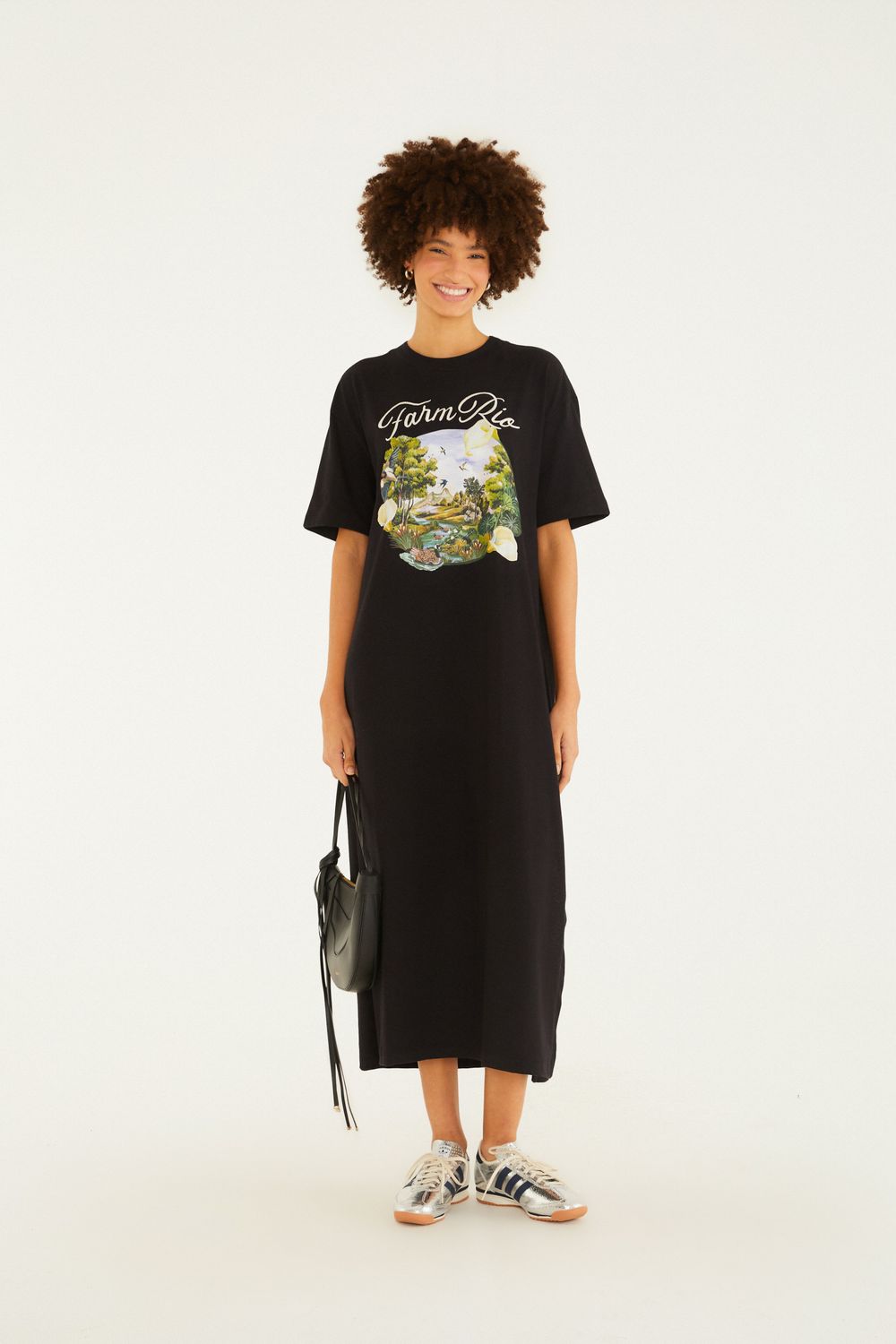 vestido midi portal paisagem do campo. com modelagem solta e mangas curtas, ele oferece conforto e estilo em uma única peça. o decote redondo traz um toque casual, enquanto a estampa única evoca a beleza serena do campo. ideal para um café entre amigas ou um passeio no parque. FARM Rio, coleção Carioca - inverno 26.-