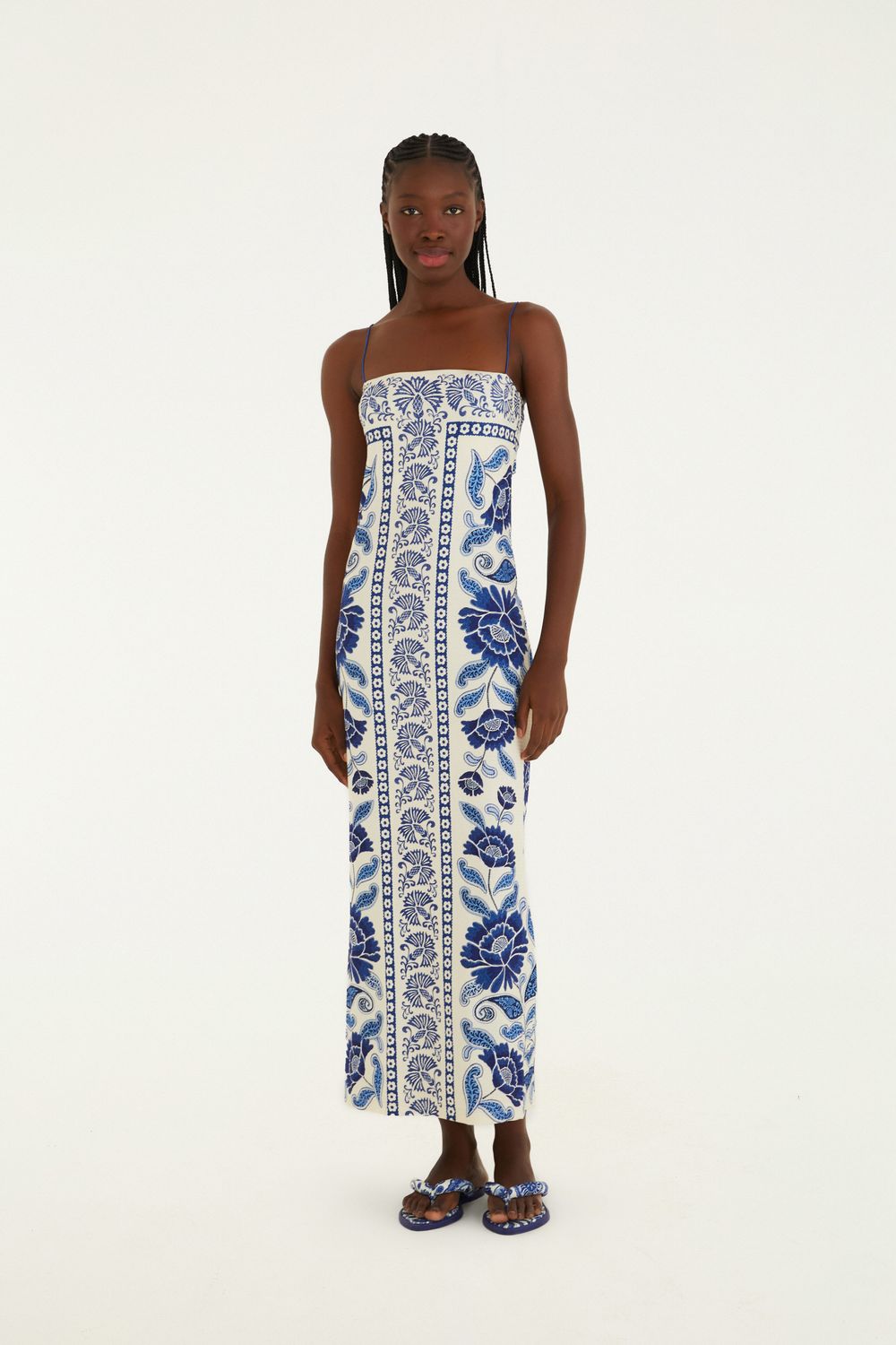 vestido midi estampado valentina. com alças finas e decote reto, esse vestido eleva qualquer ocasião com a modelagem fluida e toque leve. perfeito para um passeio casual ou um encontro especial, ele oferece conforto sem abrir mão de estilo. detalhes cuidadosos garantem um visual autêntico, ideal para dias ensolarados. FARM RIO original - verão 26.-