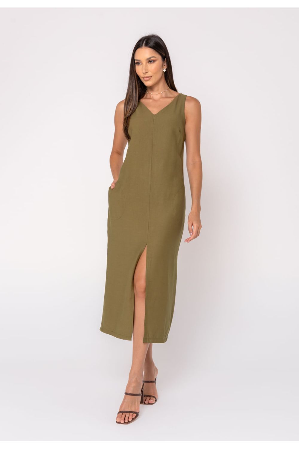 Na parte frontal, o vestido apresenta um decote V sutil, acrescentando um toque de feminilidade sem abrir mão da discrição.