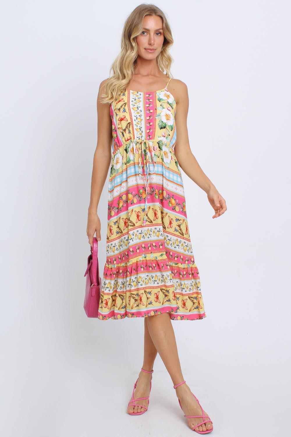Vestido midi mistura brasileira pequiá com mix de estampas possui decote reto, alças finas, elástico com tiras para amarração na cintura e babados na barra.
