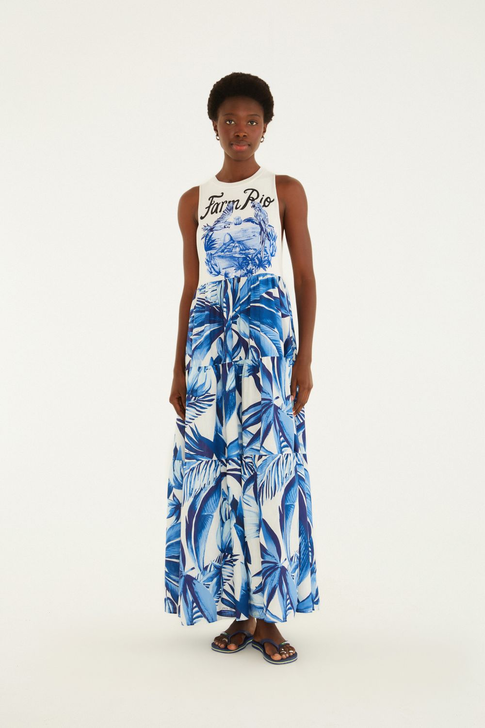 vestido midi portal araras. decote arredondado e alças largas que proporcionam conforto. a parte inferior esbanja movimento com uma fluidez envolvente, perfeita para dias de verão e encontros casuais. tecido leve e corte que favorecem o bem-estar, trazendo leveza ao dia a dia. FARM Rio, coleção Carioca - inverno 26.-