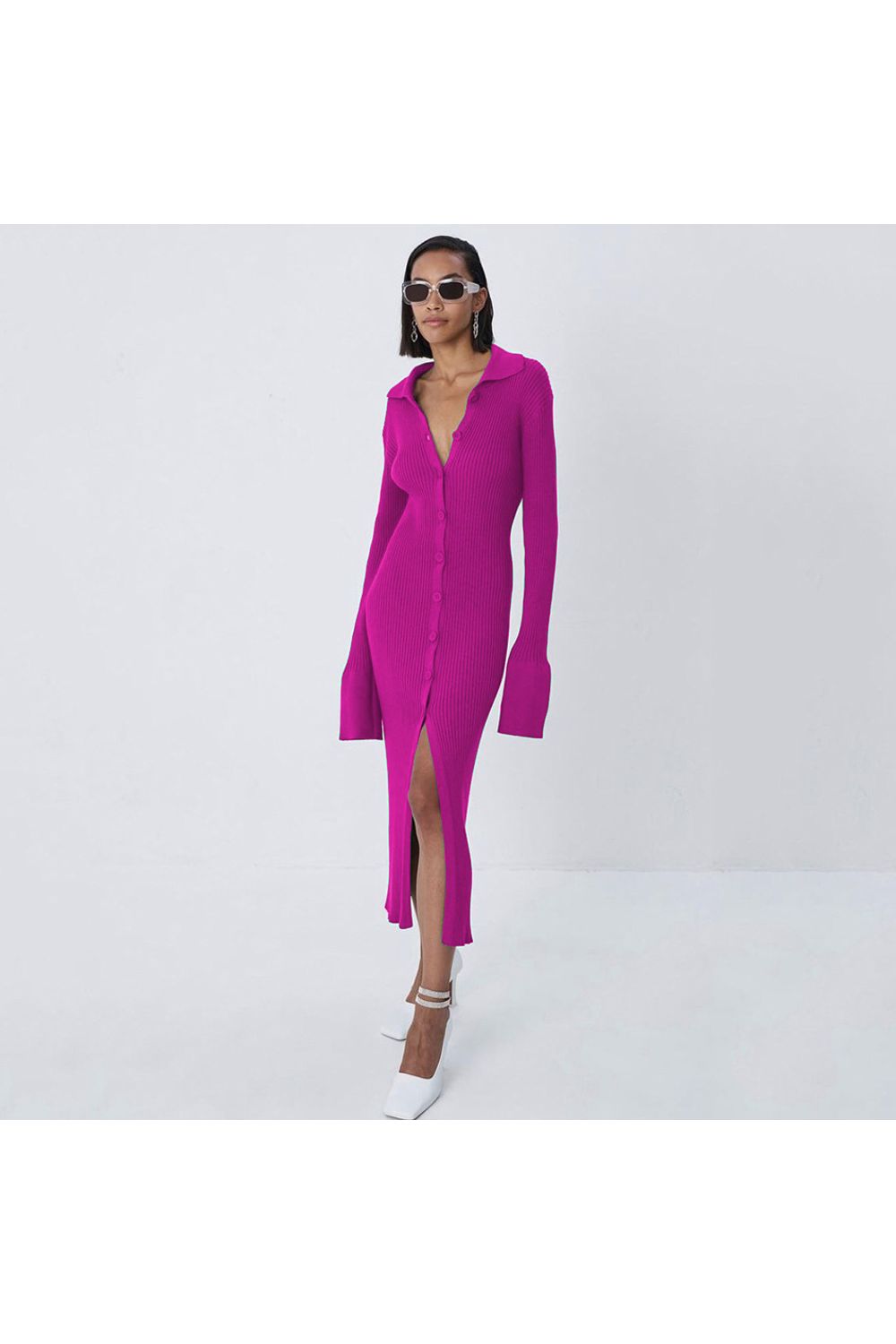 Vestido midi suéter fenda e manga sino rosa pink