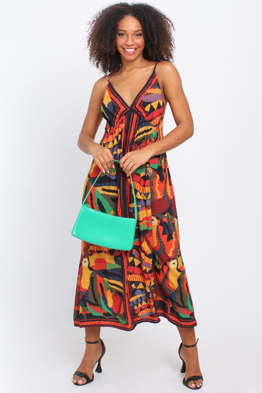 Vestido estampado tapeçaria de tucano, possui decote v com drapeado bem abaixo do busto. tem alças finas com reguladores e detalhe de linha colorida envolvendo toda a alça. tem costas decotada finalizada com elástico fino. modelo midi e soltinho de viscose.