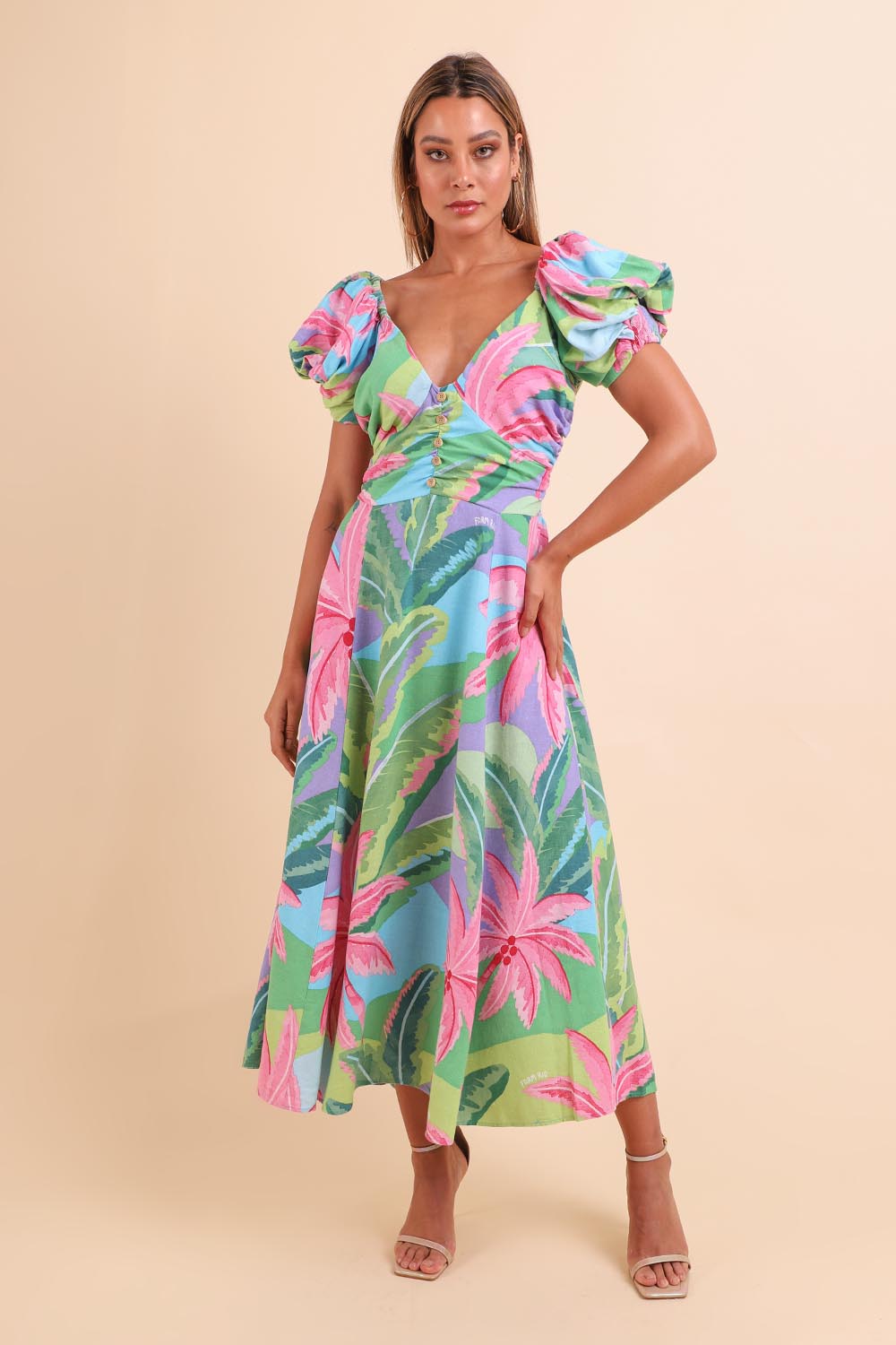 M: Busto: 76 cm; Cintura: 72 cm; Quadril: 103 cm; Manga: 29,5 cm; Comprimento: 131,5 cm.