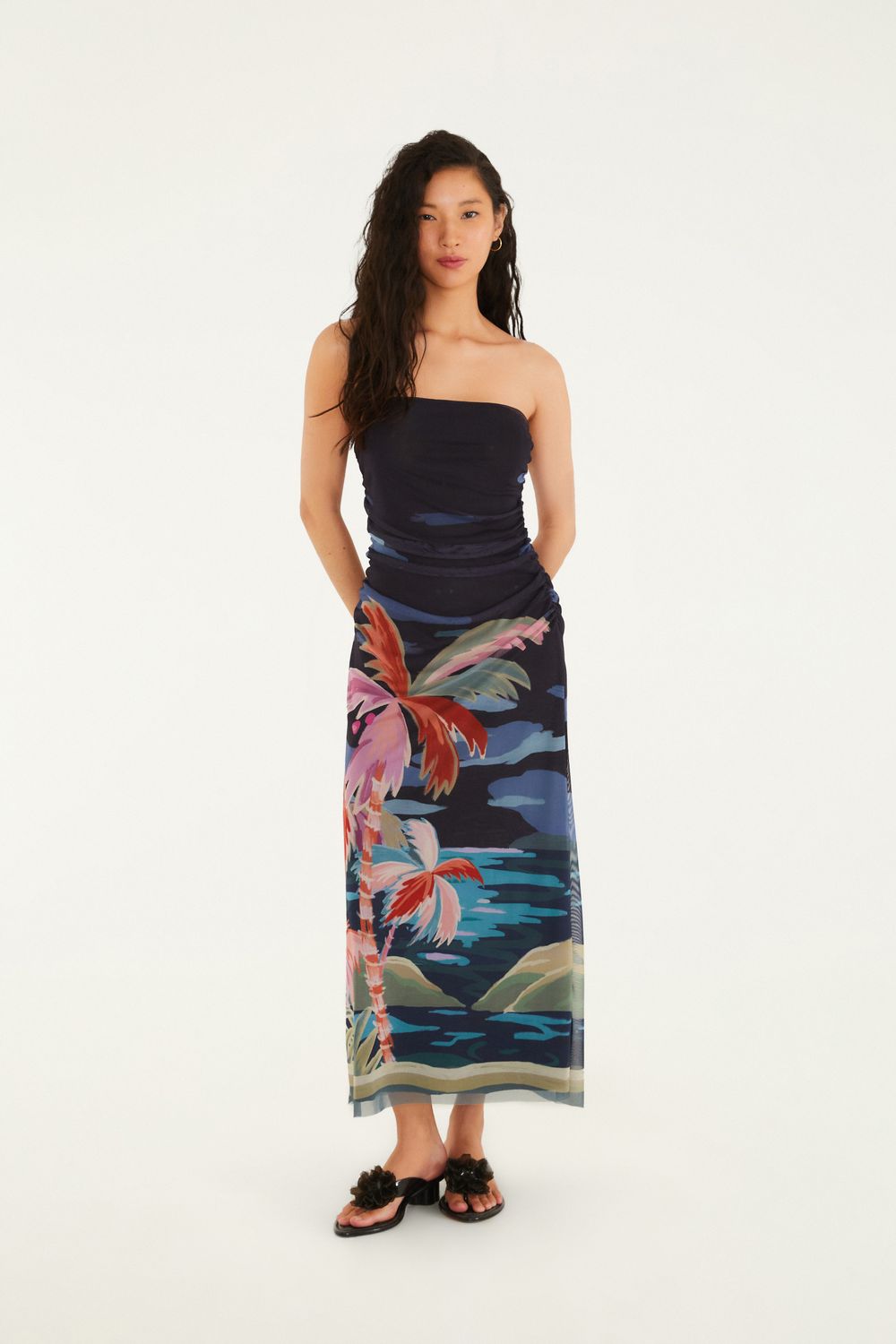 vestido midi tule estampado luar. projeto sem alças, com corte fluido e caimento leve. as camadas de tule criam uma sensação única. look ideal para jantares ao ar livre ou eventos casuais. a peça conta com acabamento delicado e forro confortável, proporcionando um charme único em cada movimento. FARM RIO original - verão 26.-