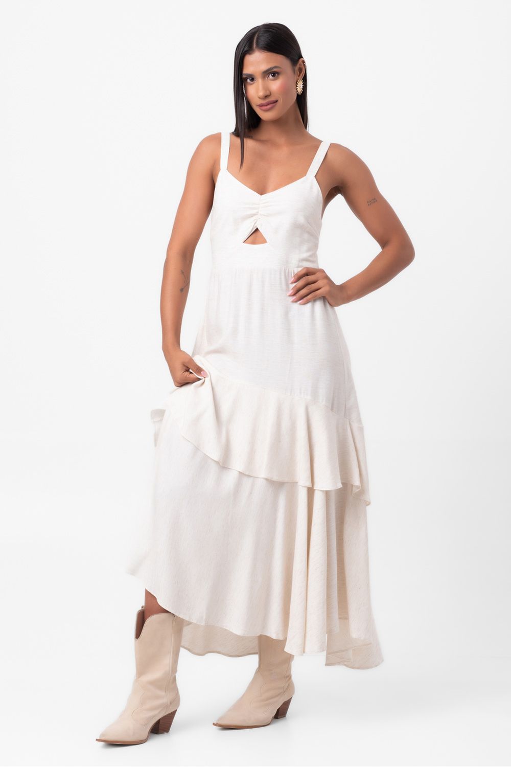 O Vestido em linho cru combina elegância e conforto. Com decote princesa e recorte vazado abaixo do busto, destaca a região. Alças largas ajustáveis oferecem conforto personalizado.