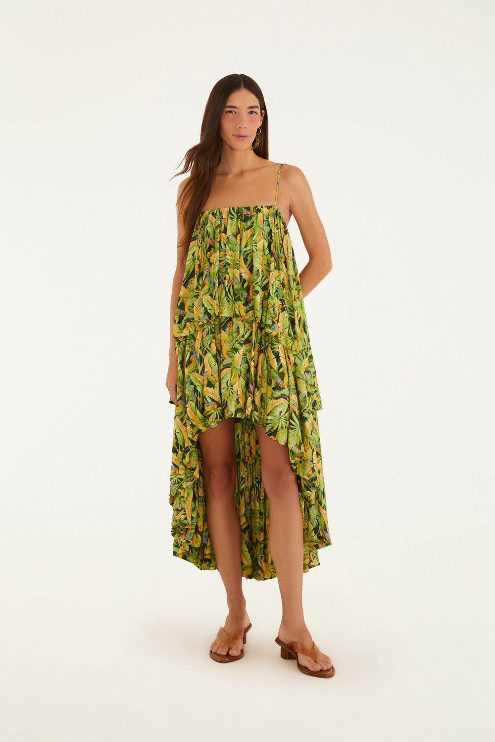 vestido mullet estampado floresta de passarinho. com alças finas e caimento fluido, o modelo destaca um corte mullet que traz movimento à peça. sua leveza e originalidade fazem dele uma escolha perfeita para ocasiões casuais ou um passeio à tarde. confeccionado em tecido leve, garante conforto e frescor o dia todo. FARM RIO original - verão 26.-
