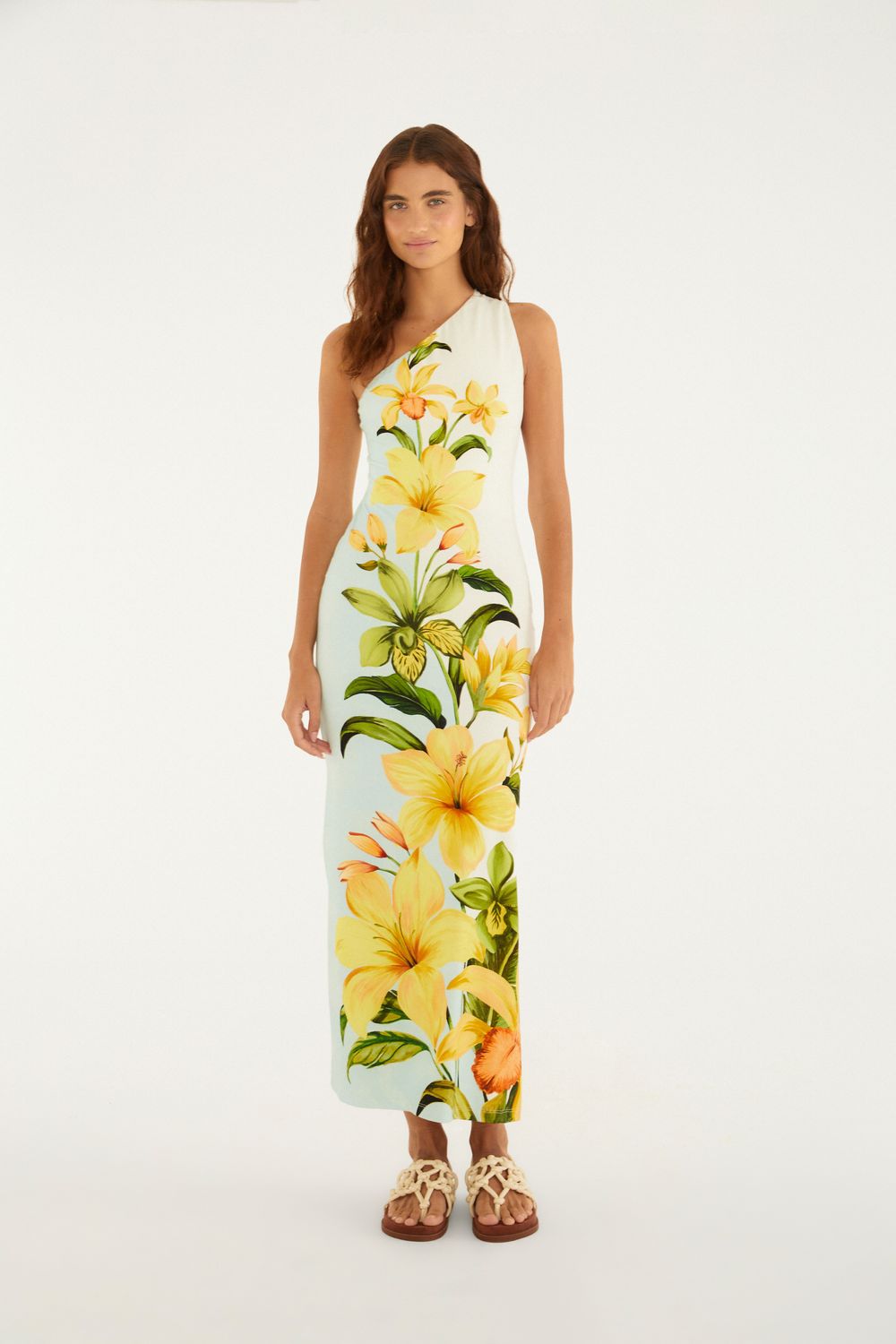 vestido ombro só floral samanta. esse modelo de ombros à mostra com corte longo é perfeito para um visual casual e charmoso. confeccionado com atenção aos detalhes, seu design destaca uma padronagem floral única que eleva a peça para ocasiões especiais. ideal para um jantar ao ar livre ou um passeio em dias ensolarados. FARM Rio, coleção Carioca - inverno 26.-