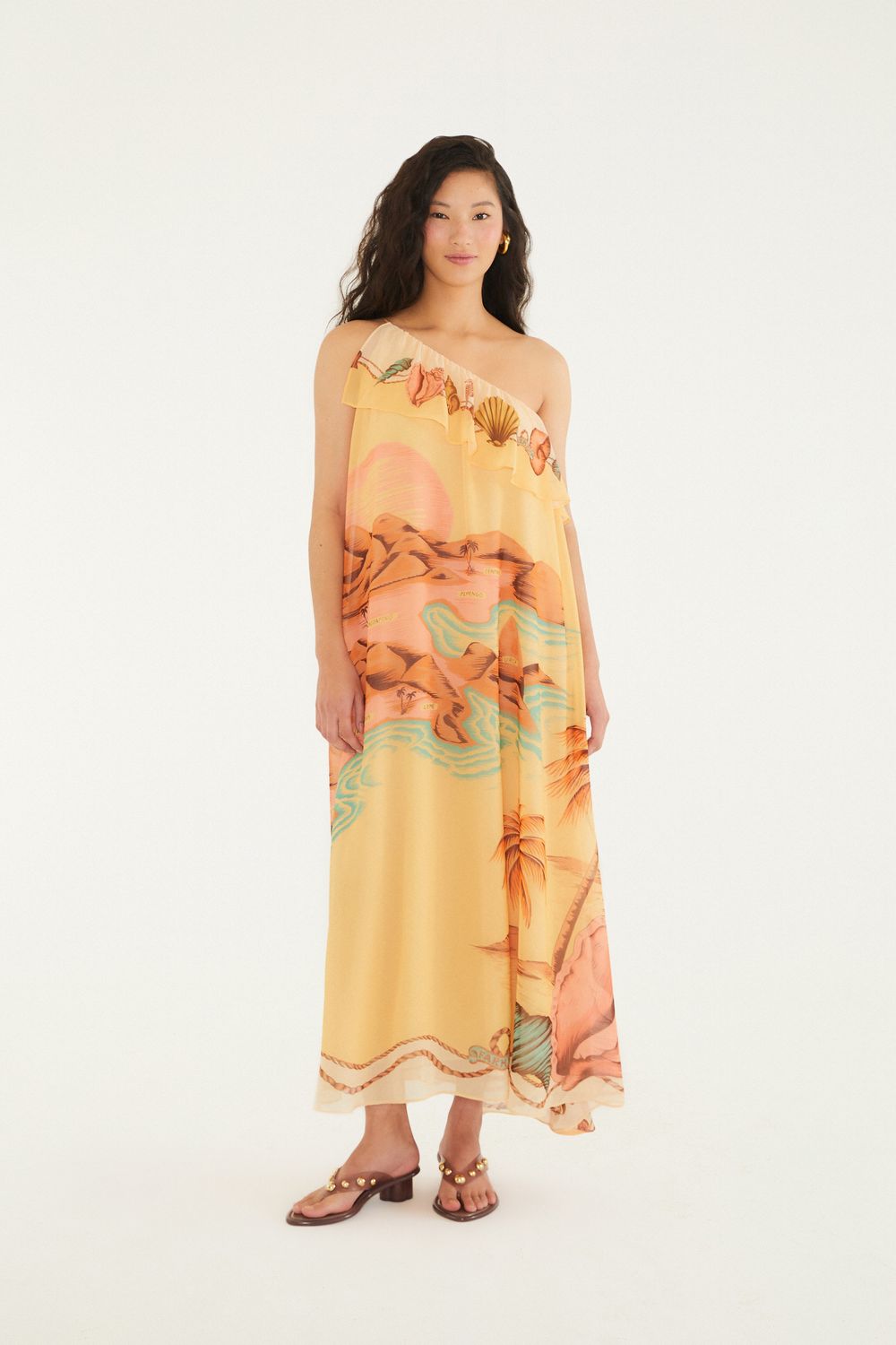 vestido ombro só estampado souvenir rio. possui decote assimétrico e alça única que valoriza os ombros com charme único. sua modelagem fluida confere conforto e leveza, ideal para um passeio casual ou um dia ensolarado na cidade. FARM RIO original - alto verão 26.-