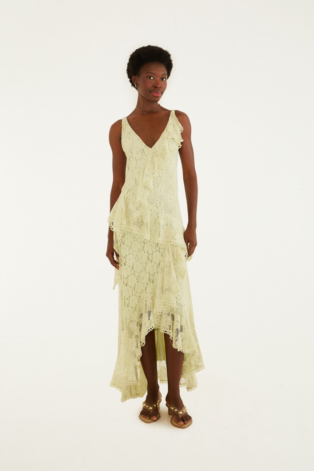 vestido patch renda. apresenta decote em v, alças finas e movimento fluido. o corte assimétrico traz leveza, enquanto os detalhes em renda elevam a peça, tornando-a perfeita para ocasiões especiais ou um passeio casual de verão. FARM RIO original - alto verão 26.-