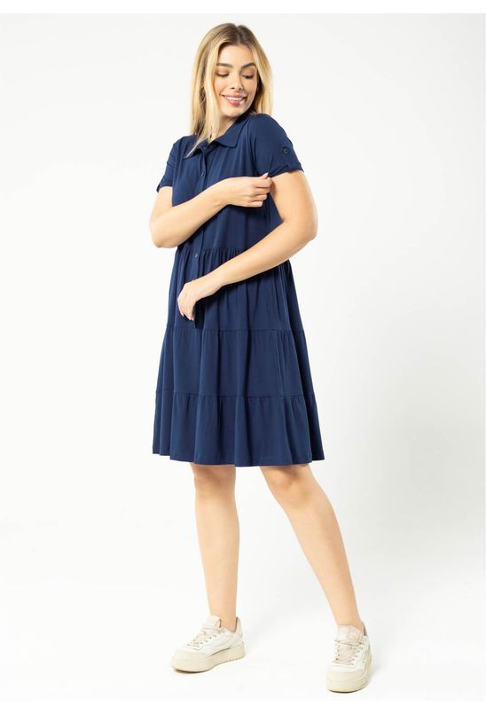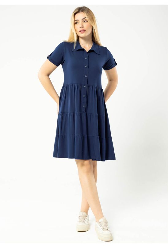 Mangas curtas com detalhe em martingale e o decote possui fechamento por botões.