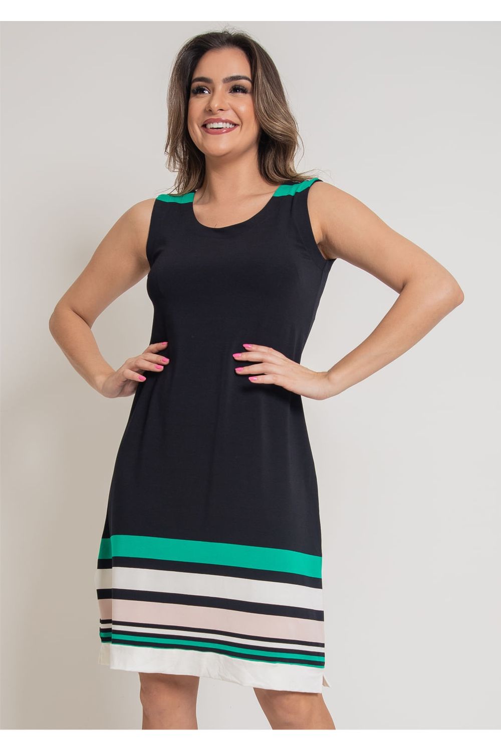 Vestido curto em malha listrada, em tons de Preto, Off White e Verde.