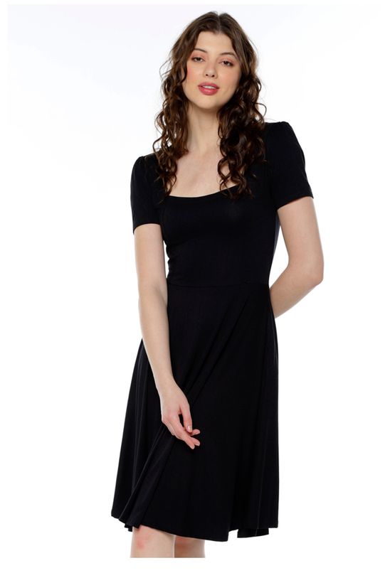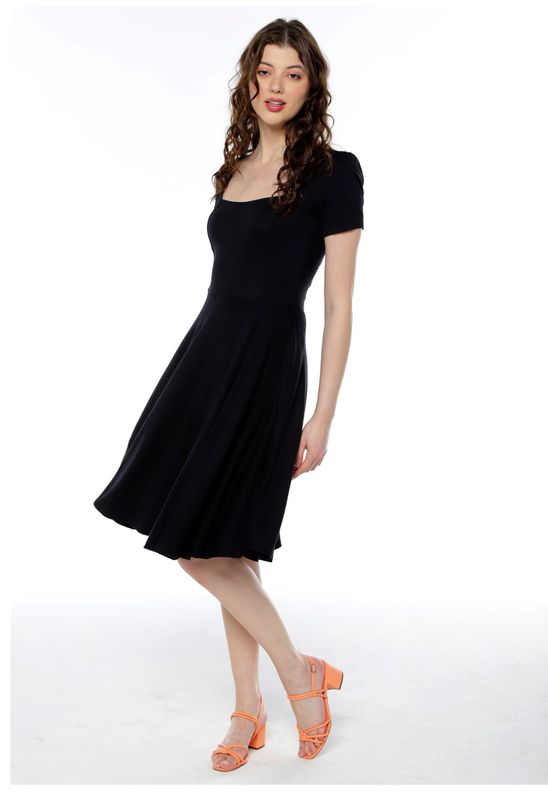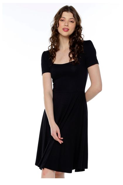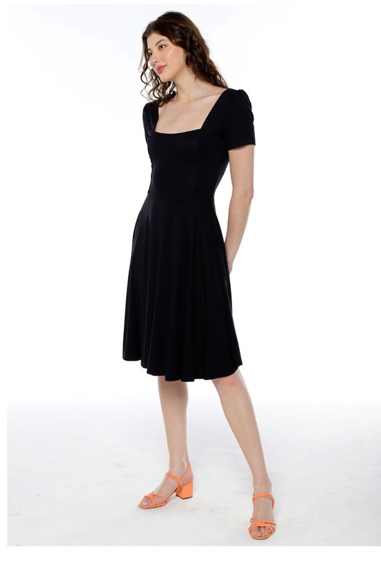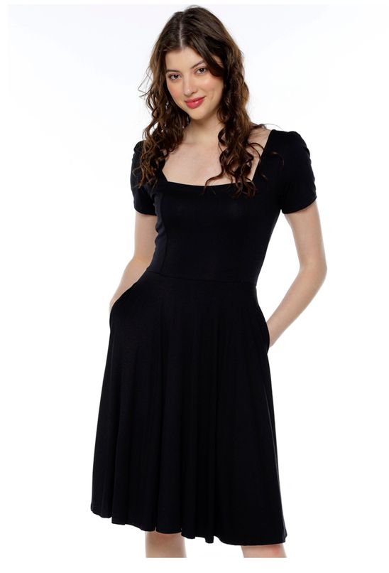 Vestido Preto Midi Decote Quadrado Manga Curta Rodado Sob