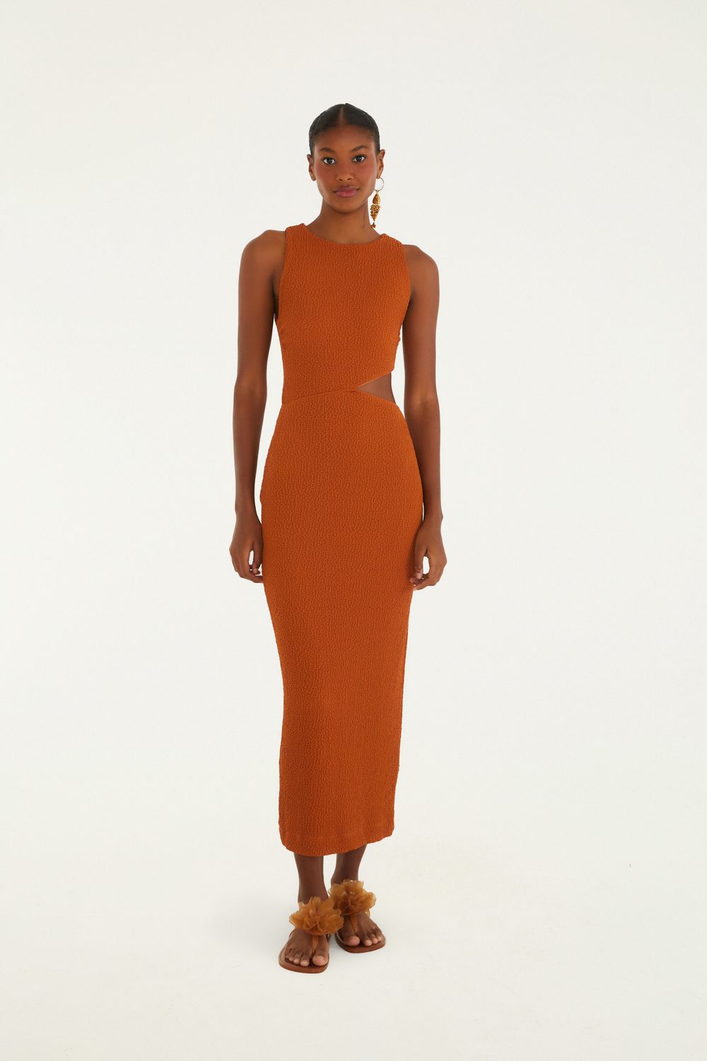 vestido recorte colméia. possui modelagem ajustada e sofisticada com recortes laterais que trazem modernidade. as alças largas oferecem conforto, enquanto o comprimento alongado imprime um toque contemporâneo. versátil, vai do encontro casual ao jantar especial. FARM RIO original - verão 26.-