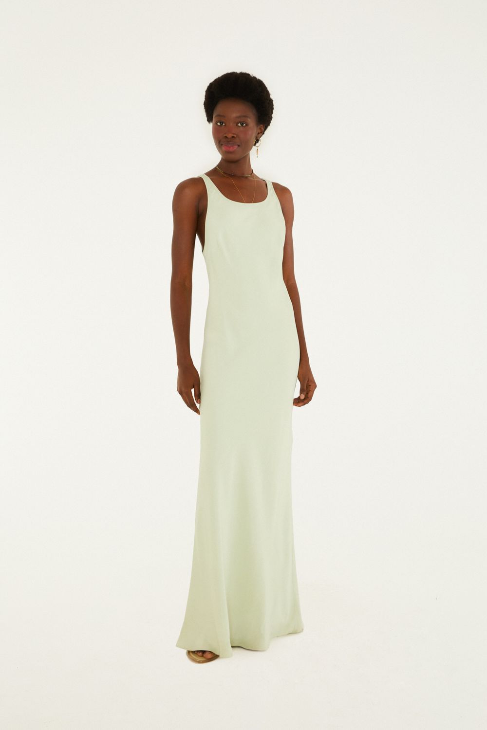 vestido regata cetim. com decote arredondado e alças finas, este vestido traz um caimento suave e fluido em cetim, transmitindo originalidade e leveza. ele é perfeito para almoços ao ar livre ou eventos noturnos descontraídos, sendo versátil para diversas ocasiões. FARM RIO original - alto verão 26.-