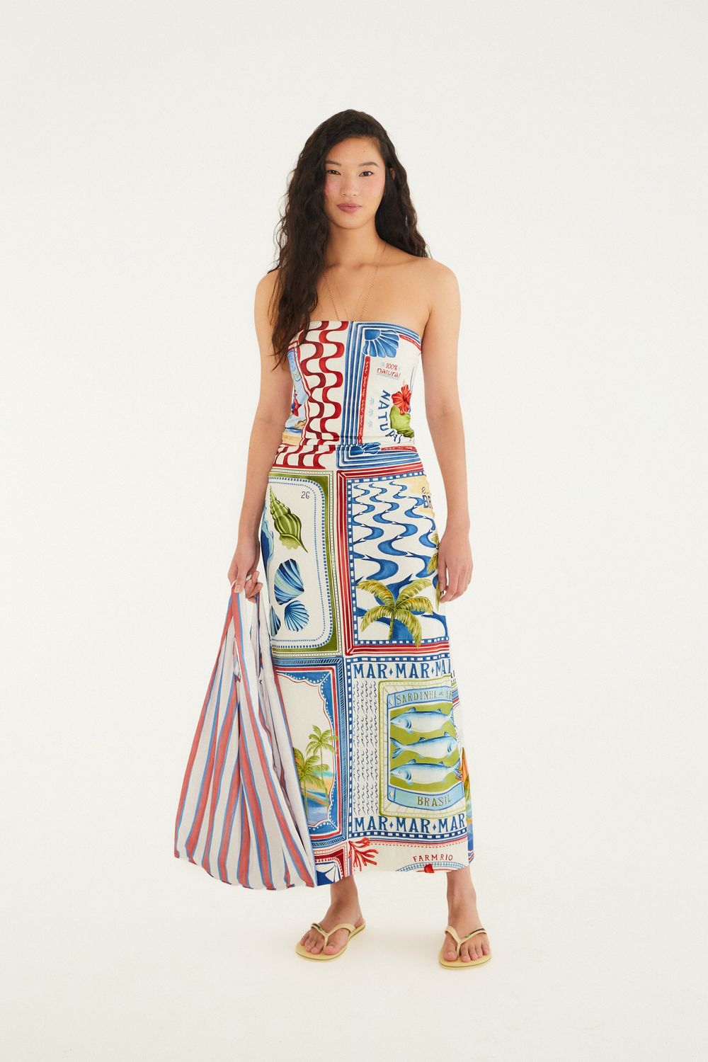 vestido sem alça estampado selo praiano. com um design único e cores vibrantes, o vestido sem alças revela os ombros com leveza. sua modelagem fluida e o comprimento médio permitem liberdade de movimento, ideal para passeios à beira-mar ou almoços ao ar livre. a estampa exclusiva traz um toque original à peça. FARM RIO original - alto verão 26.-